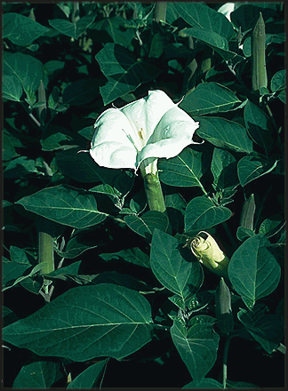 To grow: Start the seeds indoors in March. We sow about 5 seeds per 5" pot, but any type of flat will do. The seeds germinate within a few weeks, but the seedlings grow very slowly. They can be transplanted to the garden after all danger of frost has past or into an individual container once they are 3-4" tall. They can be grown in full sun or partial shade. Ours growing in the shade are larger - this may be due to other factors. The seedlings will limp along until mid-July when they suddenly take off and start growing by inches a day. Our Daturas self-sow and the seeds are said to be hardy as far north as Boston.. However, these seedlings frequently will not bloom in time to set seed. We always harvest some seed and start a few plants indoors. You might try growing one as houseplant. It will require at least a 6" pot and plenty of space. But what a wonderful thing to come to after a long hard day at work - a home filled with fragrance and a gorgeous white trumpet to herald in the evening. |