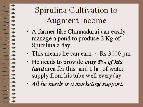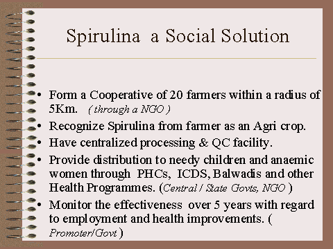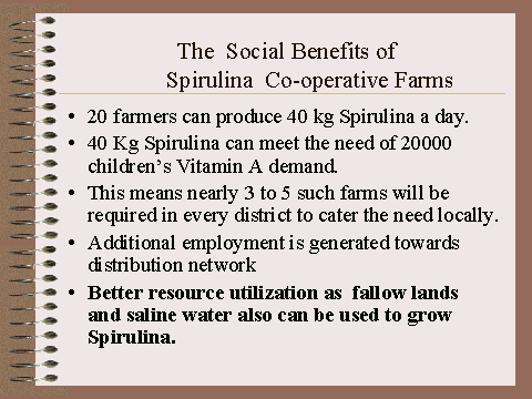 For elaborate health benefits of spirulina see the April issue of Manjari Abstract :Spirulina, a blue green alga, is a well recognized nutritional food world over. its efficacy in alleviating the vitamin A deficiency among preschool children has been reported by National Institute of Nutrition, Hyderabad. It can be easily cultivated with minimal training by all agriculturists who can augment their income during non productive months. Spirulina can grow even in brackish water or saline water. This makes it suitable for areas where water is found to be unsuitable for areas where is water is found to be unsuitable for cultivation of conventional crops. This provides an opportunity for year round employment in places otherwise having low employment potential. Spirulina thus grown can be distributed through Primary Health Centres to take care of the nutritional needs of the rural women and children. The cultivation and marketing can be organized by co operative means through suitably supported government schemes. The posters will provide conceptual elaboration of the theme and its relevance in sustainable development.