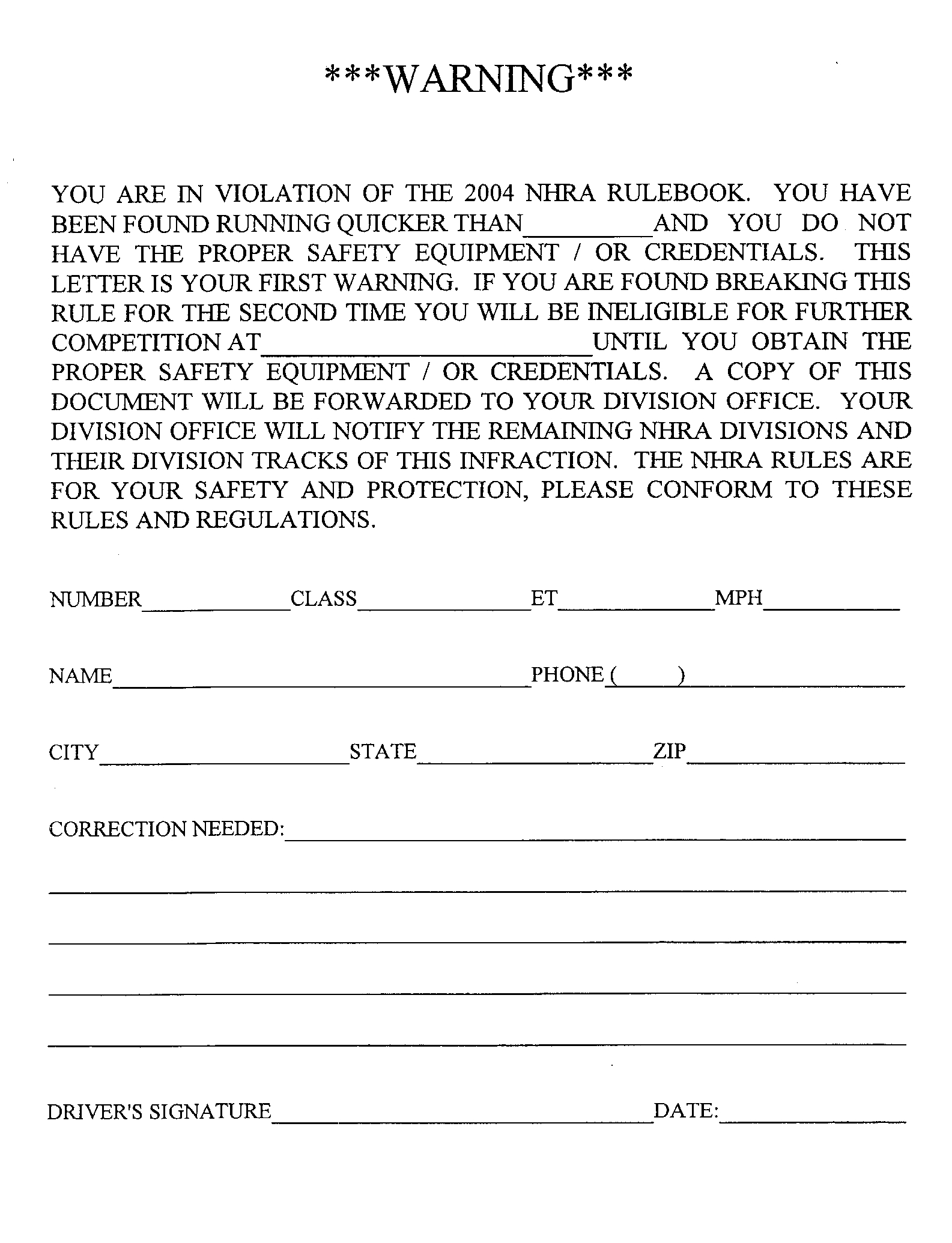 We have included a link to a new form that must be completed by us for violations of the 2004 rule book and also a notice we a received from the NHRA regarding Support Vehicles and Spectators in the staging lanes. Please review them and feel free to ask any questions you may have!