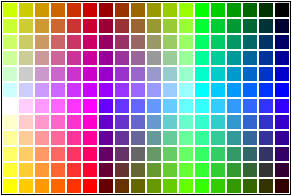 You should only use the 216 colors in the standard palette supported by both Internet Explorer and Netscape Navigator to ensure that your page will look good on systems running in 256-color mode. These colors include any combination of red, green, and blue components of 0, 51, 102, 153, 204, and 255 (hex 00, 33, 66, 99, CC, and FF). The following graphic shows all 216 colors: