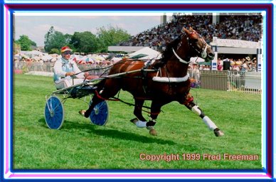 S:Vance Hanover D:Teeny Teeny This is the official photo finish photo of the 1999 Interdominion final,held in New Zealand. This was 'Sandi's' third win in a row and the first Australian horse to win three consecutive Interdominion series. His trainer/driver/part owner Brian Hancock said 'he may not have been an out and out champion but he was consistenly the best of his time' Sandi retired aged 8, this year to stud duties in New Zealand where he was bred and with winnings of over $2.2million. His wins included 3 Interdominions, Trueuer Memorial twice, Miracle Mile, WestEnd Cup Sth Aust. West Aust.Cup, Australasian Pacing Championships, Ben Hur, and many more. He retired a 'true Aussie Champ' with a farewell tour of all the states of Australia so people could say a deserved goodbye to Our Sir Vancelot.