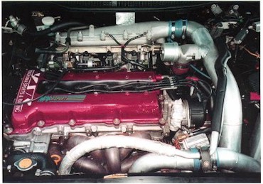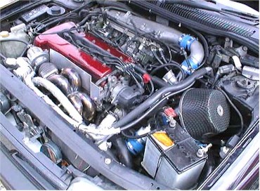 TRUST custom exhaust manifold fitted with Garret T35 turbo and HKS external wastegate blowing out through a TRUST exhaust system. The intercooler has been replaced with a custom larger unit fitted behind the front bumper cut away. HKS low compression piston and highlift cams are the only internal mods together with a NISMO triple plate clutch. The fuel pumps been rated to a bigger BOSCH item with 500cc NISMO injectors. It's still got the original Nissan ECU which has been remapped (every one I've spoken to in the States and this country say the original ECU is better than any stand alone systems!). The suspension is uprated to GAB adjustable shocks and springs with EVC Green stuff pads on the original disks. The car runs just 13psi at the moment but it's running around 340bhp. The engine mods where done in Japan by Yokohama sports & racing who custom built all the induction piping and recirculation dumpvavle. The car was bought from DVI in Scotland, with a full 3 year warranty. Next mod planned is a Tomei or JUNAuto stroker kit, but it's about £7,000 fitted and fully mapped up!