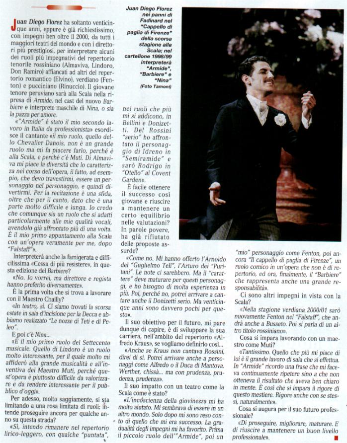 NEW!!!! Here you can read a long and interesting interview (in Spanish) with many nice pictures and listen to Juan Diego singing an aria from L'Italiana in Algeri and Almaviva's rondo' from Il Barbiere di Siviglia (both recorded during Milan concert, Nov. 1999). This link is hosted by Red Cientifica PeruanaRead here an interview with Florez (in Italian) L'Italiana in Algeri, Paris February 2000 Here you can read a review appeared on the web Otello, London January 2000 Here you can read a review appeared in The Times and here another one from The Guardian Nina, o sia la Pazza per Amore, Milan Septembre-Octobre 1999 "[...]Le parti di Nina, splendidamente interpretata da Anna Caterina Antonacci, quella di Lindoro (l'altrettanto splendido Juan Diego Flòrez) e quella del pastore (il bravo Giuseppe Filianoti), che canta la malinconica canzone popolare, accompagnato da zampogna e ciaramella (volgarmente, piffero), sono venute in primo piano con l'intensità voluta da Paisiello.[...]" Paolo Gallarati, La Stampa, 27th Septembre, 1999 "[...]...impegno attorale e vocalistico della perfetta compagnia: l'elegantissimo Michele Pertusi, l'adolescenziale Juan Diego Flòrez, la piccante Donatella Lombardi e il vellutato coro." Angelo Foletto, La Repubblica 27th Septembre, 1999 Il Barbiere di Siviglia, Milan June-July 1999"[...]Altrettanto bravo è stato Juan Diego Flòrez. Il suo Almaviva profuma di sventatezza giovanile e più che un Grande di Spagna è soprattutto un ragazzo innamorato e impulsivo, a cui l’età matura non ha ancora insegnato il cinismo ed il calcolo. Ma va bene così. Attore disinvolto e simpatico, Flòrez si riallaccia maggiormente alla tradizione del tenore rossiniano alla Alva che non a quella del mirabolante virtuoso alla Blake. Suoi punti di forza sono un timbro soave e vaporoso, baciato all’origine dalla naturalezza e dalla spontaneità dell’emissione. Tutto nel suo canto è gentilezza, palpito intenerito, tenui e delicate tinte pastello. Il registro acuto è già bastatamente luminoso e a fuoco, e siamo certi che con il tempo si rinsalderà ulteriormente.. [...]" Nicola Salmoiraghi - L’Opera, n° 131 July-August 1999 "[...]E, quanto alla compagnia di canto, tutta giovane, c'è solo da lodarla in blocco: Roberto Frontali nel ruolo del titolo, Sonia Ganassi quale Rosina, Juan Diego Flòrez come Almaviva..." Michelangelo Zurletti - La Repubblica, 19th June 1999 "[...]Anche i cantanti sono stati eccellenti e la sgranatura dei vocalizzi è venuta fuori nitida e scorrevole, come se fosse eseguita dai violini e dai flauti. [...] Grandi ovazioni hanno invece accolto Juan Diego Flòrez (Almaviva)...." Paolo Gallarati - La Stampa, 19th June 1999 "[...] I cantanti hanno potuto esprimersi al meglio. Forse è possibile osservare una certa asprezza nella voce di Juan Diego Flòrez, ma non si può certo negare le sue capacità espressive. [...]" Armando Torno - Il Sole-24 ore, 20th June 1999 Maria Stuarda, Torino March 1999 "[...]Come altre opere di Donizetti, anche Maria Stuarda è scritta per dei fuoriclasse: le esigenze vocali sono altissime, richiedono drammaticità pari all’agilità, e quelle espressive pongono al cantante il seguente imperativo: visto che il compositore ha fretta e non sempre può dare il meglio di sé, sei tu, interprete che devi dar vita a personaggi appena accennati. Meglio di tutti ha risposto a questo impegno il tenore Juan Diego Florez dalla voce limpidissima e dalla pronuncia perfetta. Nonostante la regia di Jonathan Miller non gli abbia chiesto altro che portar le mani al petto o allargare le braccia in gesti supplichevoli, ha disegnato con precisione la figura dell’innamorato infelice che tenta invano di sottrarre Maria alla violenza della regina Elisabetta.[...]" Paolo Gallarati - La Stampa, March 18th, 1999 "[...]Se poi le due regine si contendono i favori di un solo tenore si devono accontentare di Juan Diego Florez, che è il migliore quanto a musicalità e vocalità ma certo molto leggero (che fine farà l'esile Florez tra una Shkosa da cannoneggiamento e una Devinu piena di artigli?).[...]" Michelangelo Zurletti - La Repubblica, March 26th, 1999 "[...]Meglio si comporta Juan Diego Flòrez, tenore di estrazione rossiniana, qui alle prove con una parte da tenore romantico non perfettamente confacente alle sue caratteristiche vocali. La voce è quella del tipico tenore leggero, gradevole nel timbro, corretta nell'emissione e sicura negli acuti: in quest'occasione mi è parsa propensa a lasciar da parte i suoni nasali, senza tuttavia scongiurare i limiti di un canto confinato in un'elegante, a tratti monotona, genericità espressiva. Ma dopo averlo ascoltato a Torino nei panni di Elvino ne La Sonnambula e ora in quelli di Roberto, Conte di Leicester non mi sento di predire, per i migliori e promettenti sviluppi della carriera di questo giovanissimo tenore peruviano, un roseo futuro nel repertorio tenorile romantico belliniano e donizettiano. Potrei anche sbagliarmi, ma penso che in Rossini - in particolare nel repertorio comico - Flòrez possa oggi ottenere il meglio di sé, sperando che il superattivismo non gli faccia dimenticare lo studio necessario per affinare il già ammirevole ma non completo bagaglio tecnico.[...]" Alessandro Mormile - L'Opera, Aprile 1999 Il Barbiere di Siviglia, Rome January 1999 "[...]La coppia dei giovani amorosi era formata [...] e da Juan Diego Florez (Almaviva) considerato molto promettente, ma in realtà deludente per volume di voce e intonazione. [...]" Maria Delogu, L’Opera, March 1999 Alahor en Granada - Seville, Octobre 1998 "[...]Altro artista da citare Juan Diego Florez tenore peruviano di appena venticinque anni, efficacissimo interprete di Alamar, cui ha dato vertiginose evoluzioni vocali perfette e condotte con la massima disinvoltura, sintomi inequivocalbili di una personalità artistica già affermata e che comunque farà presto parlare di sé.[...]" Michele La Spina - Sipario, Decembre 1998