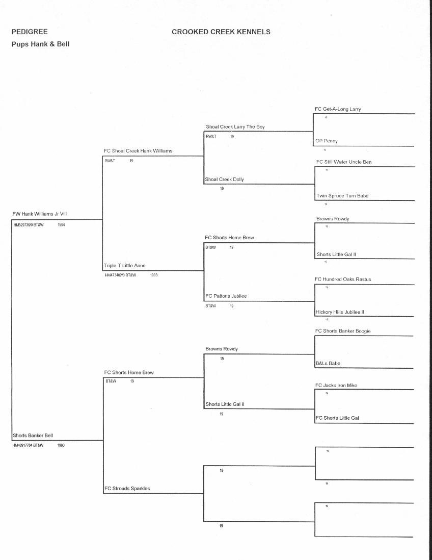Pups by F.W. Hank Williams Jr VIII & Shorts Banker Bell. Born October 8, 1998. Ready to go right now.