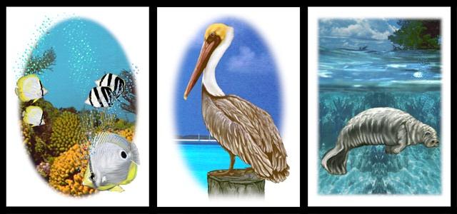 The pictures above are the fronts of three cards from the Tropical Notes Series. All of our cards are 5" X 7" with blank insides, except for Christmas cards which contain appropriate wishes. The back of the cards feature short notes describing the wildlife depicted on the front. Check the links below to see more images from the Tropical Notes Series, the Florida Lighthouse Series, and the Water Spots Series featuring sailboats and beach scenes from throughout Florida and the Caribbean. You can also see samples from our 1998-1999 line of tropical Christmas cards!
