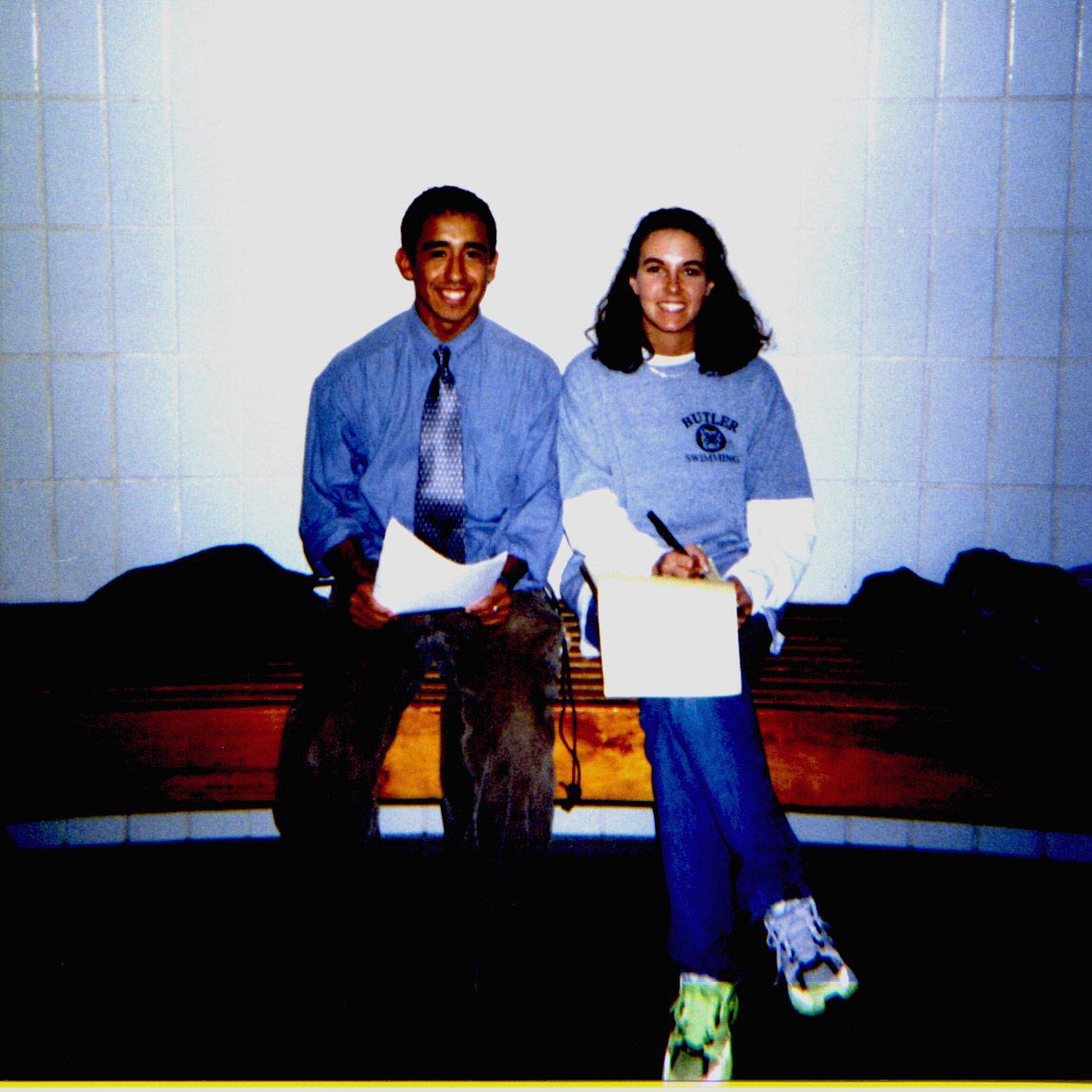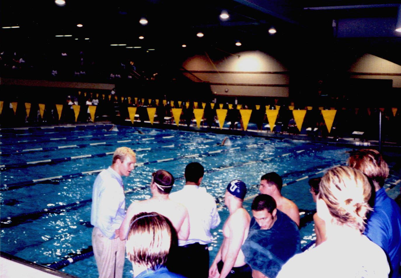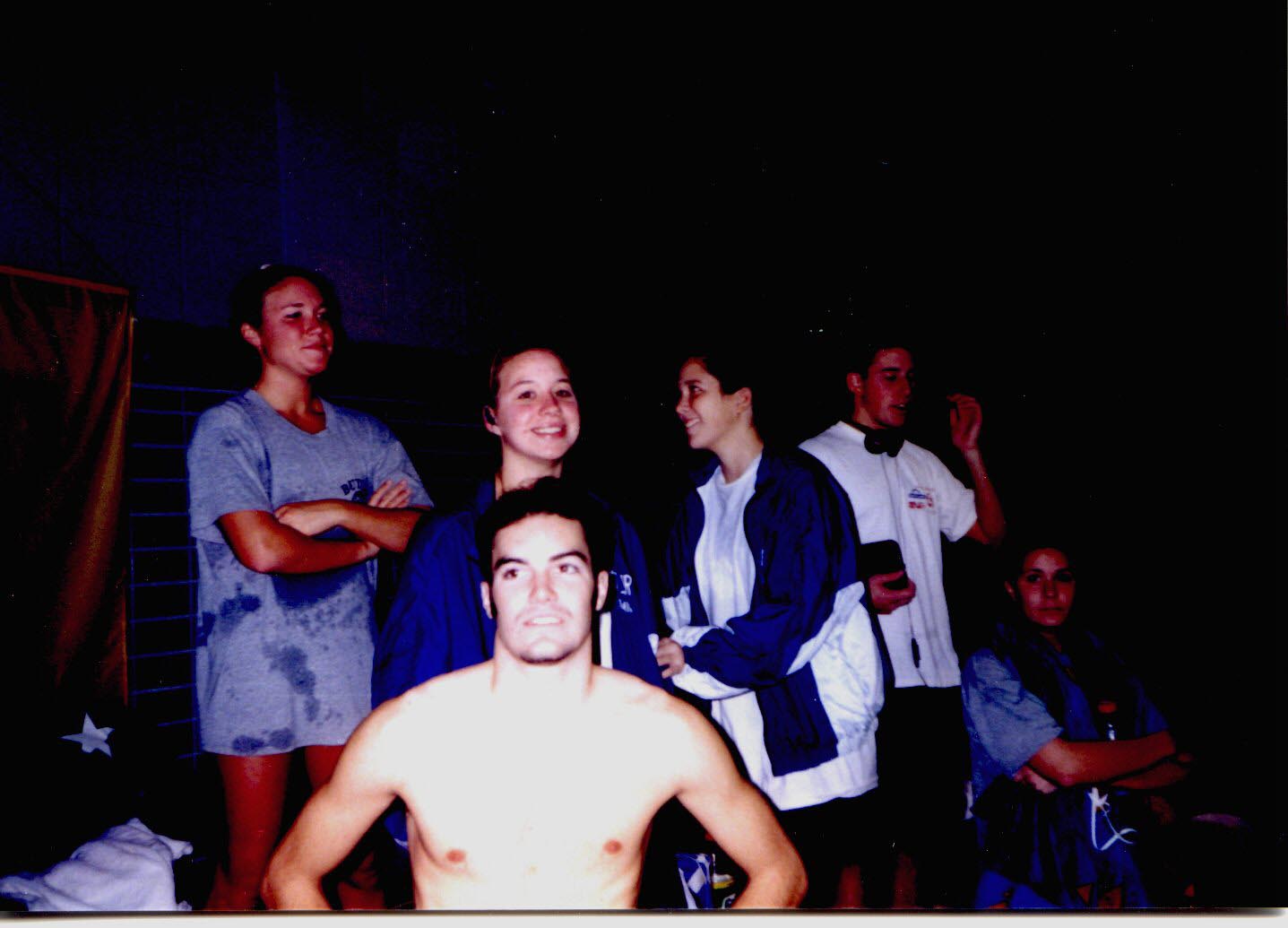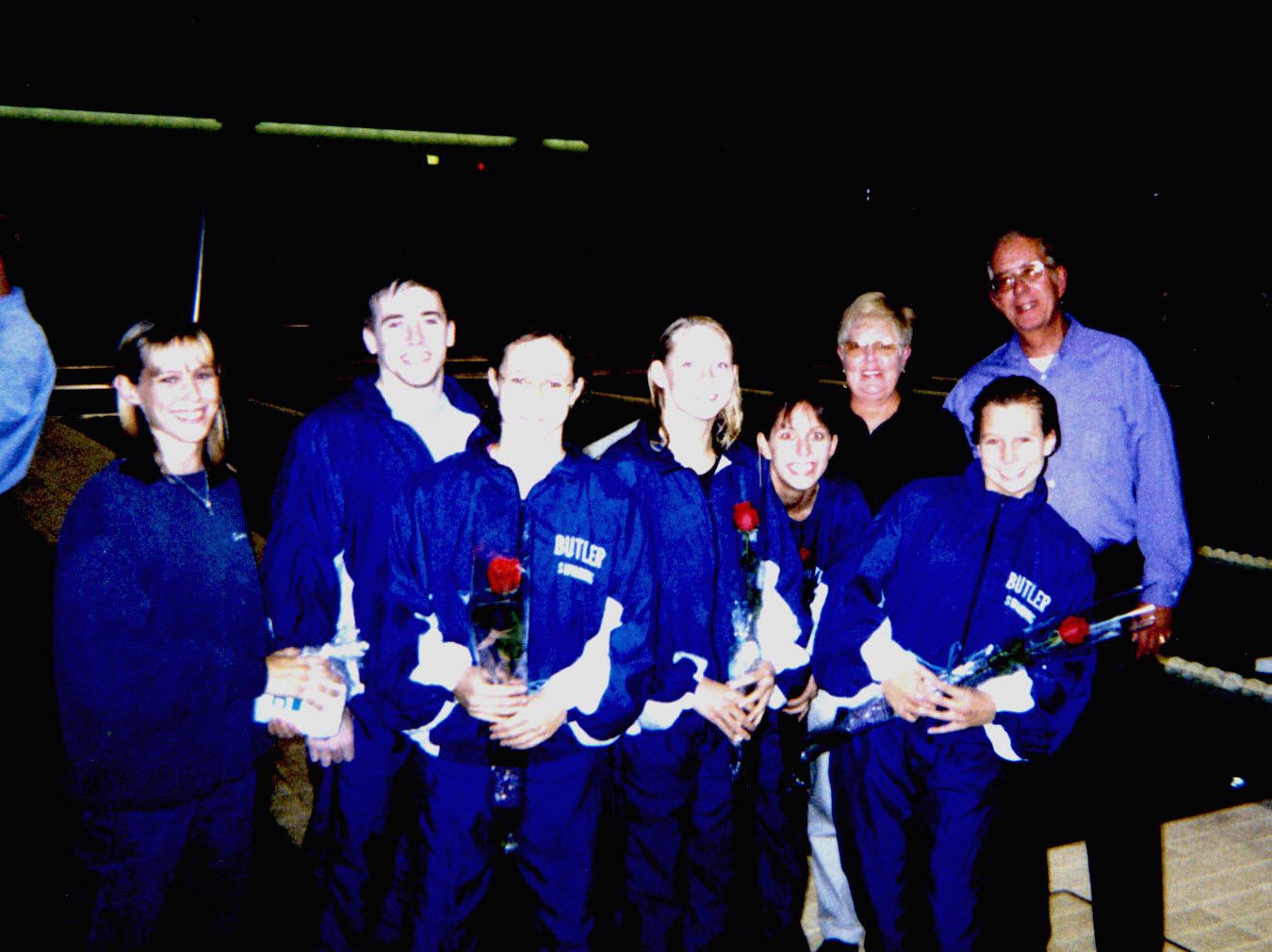 1998-1999 Seniors at the Ball State Meet at IUPUI Natatorium. Left to Right: Mike Young, Faith DeBow, Jane Stevens, Chrissy Carlson, Andrea Rybarczyk.