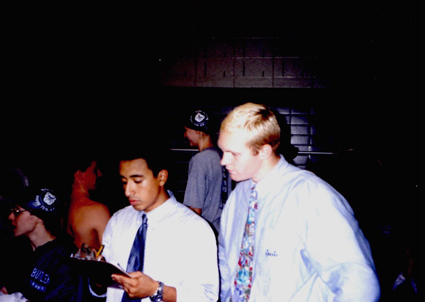 First-year Assistant Coach Mark O'Malley and Coach Lance Brennan take splits as accurately as possible.