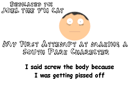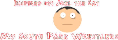 This is my first attempt at making a south park wrestler and boy does it SUCK! But I am getting a little bit better kinda...ok I'm not but still its a pain in the ass to make these things. My friend Charles Cruz (Joel the Cat) makes the best damn south park wrestlers I've ever seen in my life. I like his better then Kenny's you can visit his page at http://joelthecat.cjb.net his page is very good and I think he's going to be making a south Park section on his page soon.