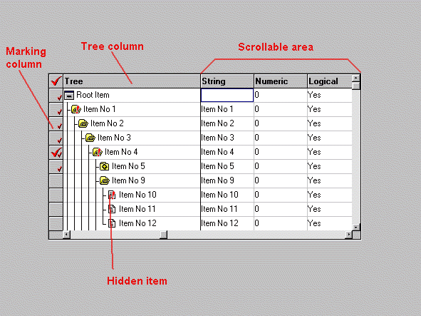 Supports operations on a tree, nodes expanding/collapsing, optional marking column, etc.