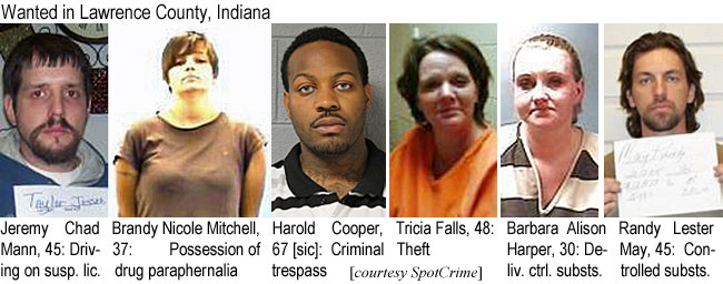 jerechad.jpg Wanted in Lawrence County, Indiana; Jeremy Chad Mann, 45, driving on susp. lic.; Brandy Nicole Mitchell, 37, possession of drug paraphernalia; Harold Cooper, 67 (sic), criminal trespass; Tricia Falls, 48, theft; Barbara Alison Haper, 30, deliv. ctrl. substs.; Randy Lester May, 45, controlled substs. (SpotCrime)