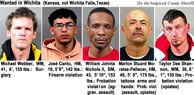 Borf 's weekly BONUS:Wanted in Wichita (Kansas, not Wichita Falls, Texas) (Sedgwick County Sheriff): Michael Webber, WM, 41, 6', 155 lbs, burglary; José Cantu, HM, 19, 5'8",