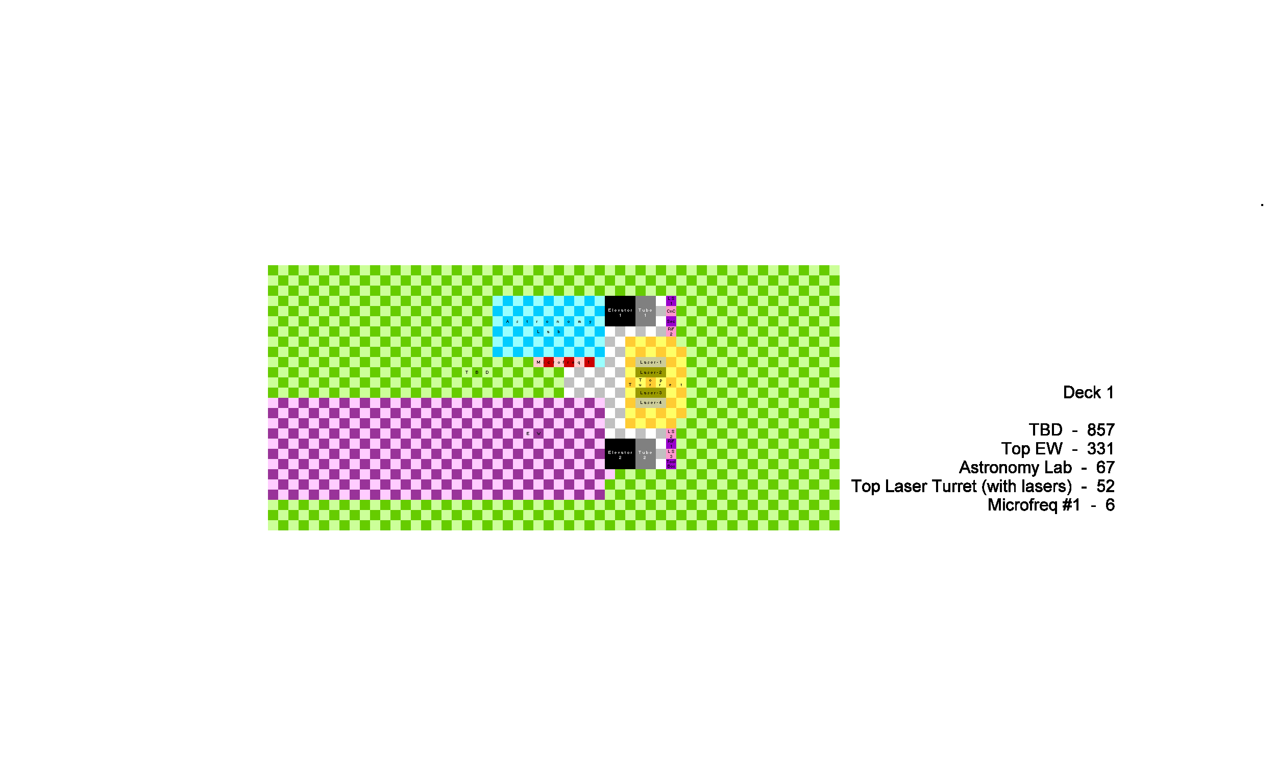 | Deck 1 is the uppermost deck of the ship. It houses the top turret, containing 4 Mk.10 lasers with a 360° arc of fire. The EW suite covering the area above the ship, the Astronomy Lab and the primary Microfrequency radio are positioned on this deck. Part of the Tacheon-Beam Dictor is also found on this deck. |