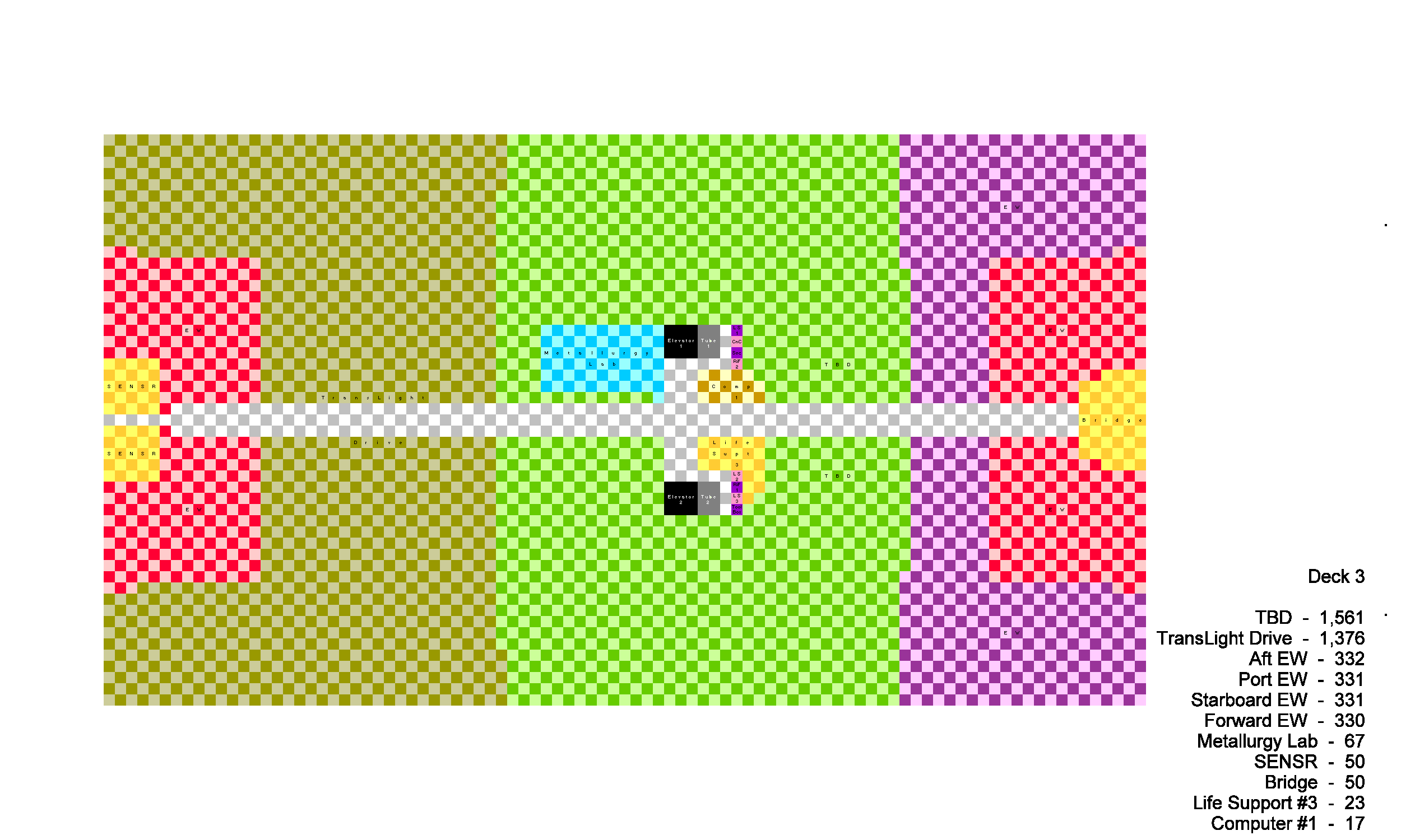 | Deck 3 houses the EW generators covering the port, starboard, forward and aft areas of the ship. Also found here are the Metallurgy Lab, the primary computer, the emergency life support system, that part of the SENSORs responsible for the rear hemisphere and the bridge. Part of the Tacheon-Beam Dictor and part of the TransLight Drive are on this deck. |