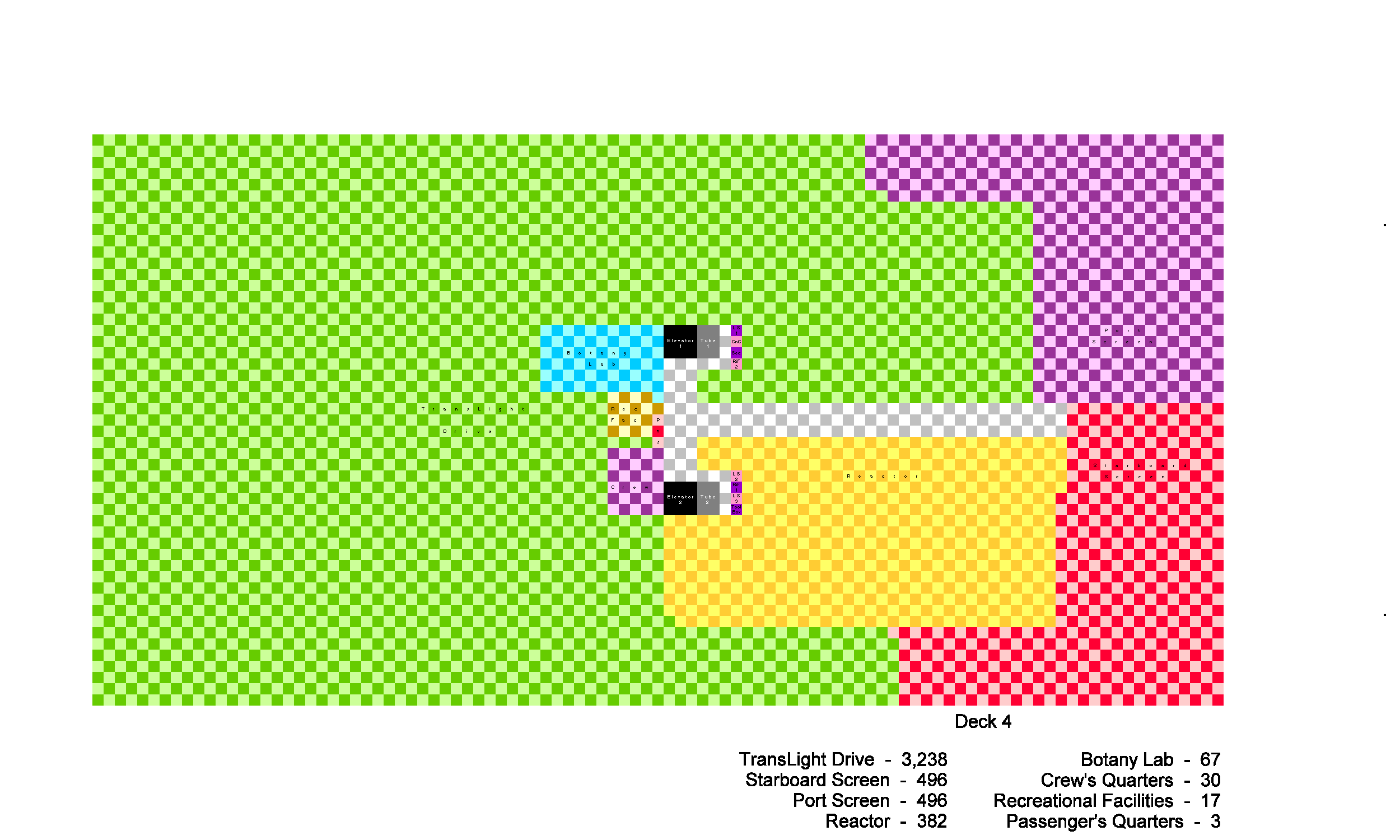 | Deck 4 has the Botany Lab, the crew's quarters, the passenger's quarters and the recreational facilities. Part of the TransLight Drive, part of the fusion reactor, part of the port Screen generator and part of the starboard Screen generator are located on this deck. |