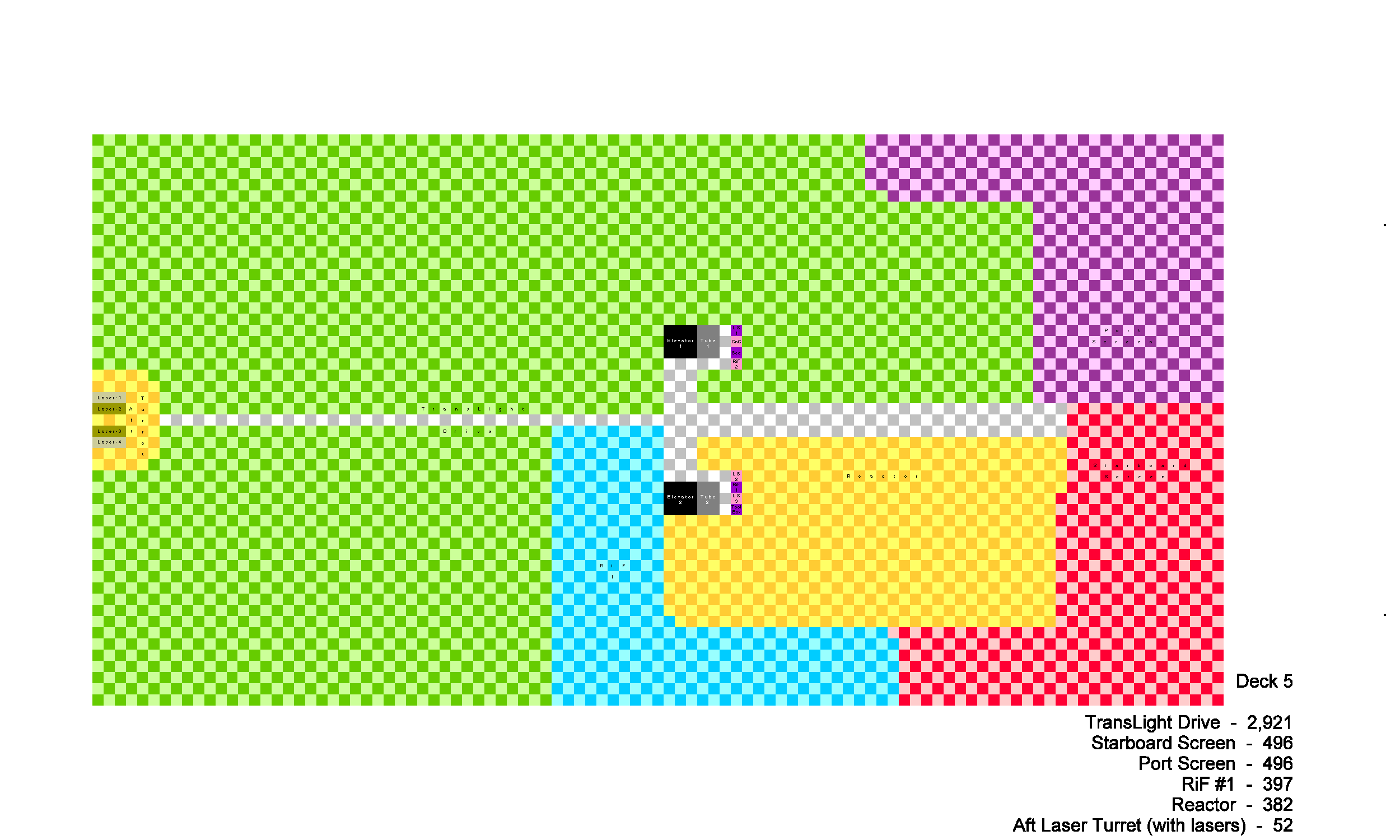 | Deck 5 houses the aft turret, containing 4 Mk.10 lasers with a 360° arc of fire, as well as the primary RiF generator. Part of the TransLight Drive, part of the fusion reactor, part of the port Screen generator and part of the starboard Screen generator are located on this deck. |