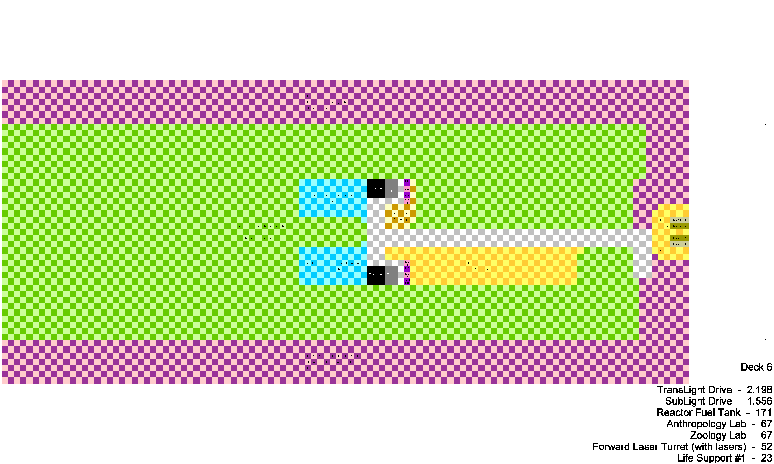 | Deck 6 houses the forward turret, containing 4 Mk.10 lasers with a 360° arc of fire, the Anthropology Lab, the Zoology Lab, the primary life support system and the reactor fuel tank. Part of the TransLight Drive and part of the SubLight Drive are located on this deck. |