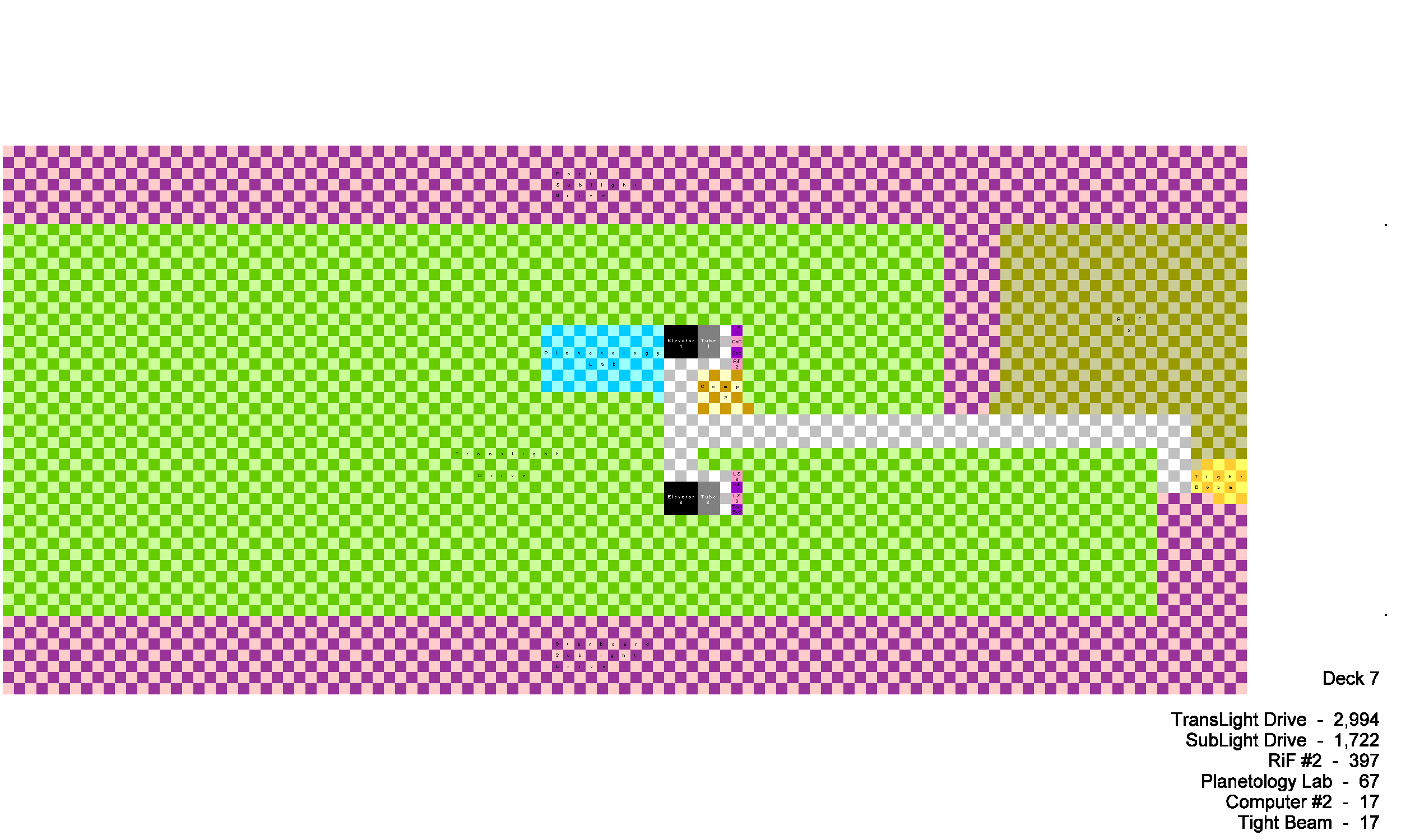 | Deck 7 contains the Planetology Lab, the backup computer, the backup RiF generator and the Tight-Beam laser communication system. Part of the TransLight Drive and part of the SubLight Drive are located on this deck. |