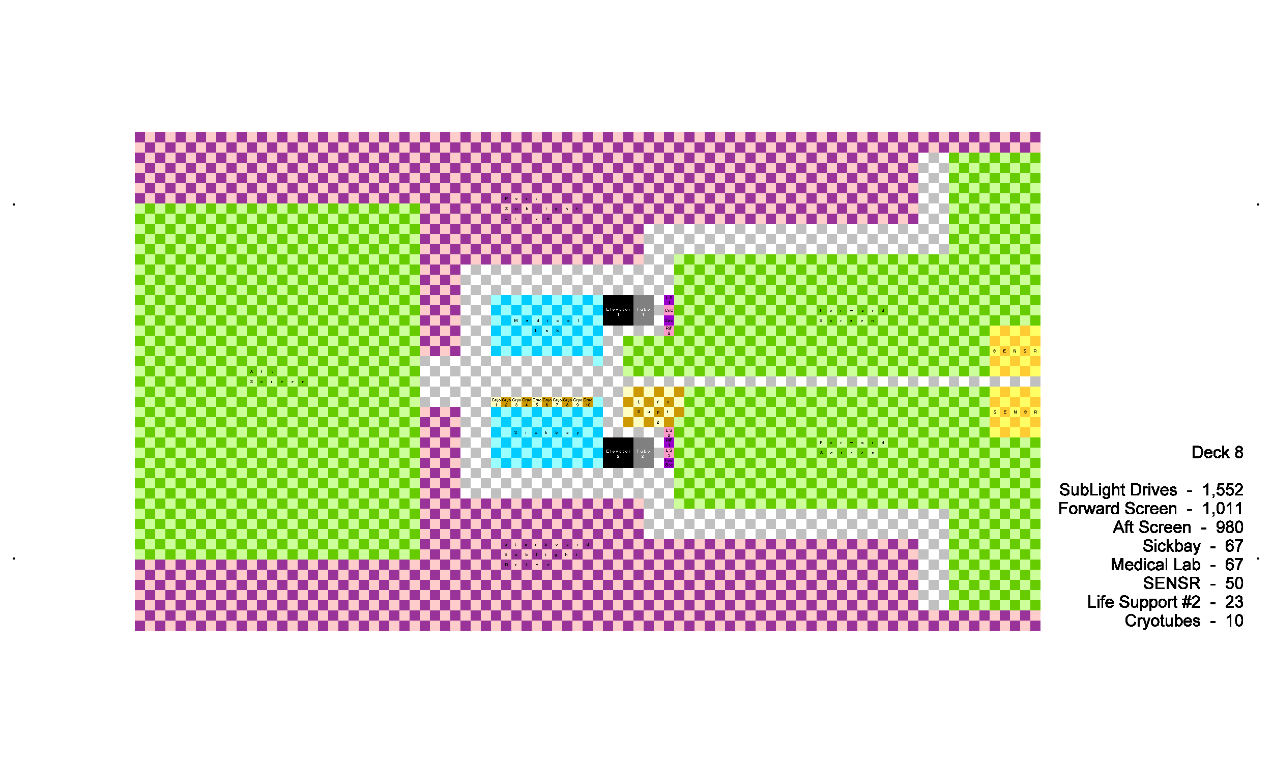 | Deck 8 has the forward Screen generator, the aft Screen generator, the Medical Lab, Sickbay, 10 cryotubes and the backup life support system. Part of the SubLight Drive and part of the forward SENSRs are located on this deck. |