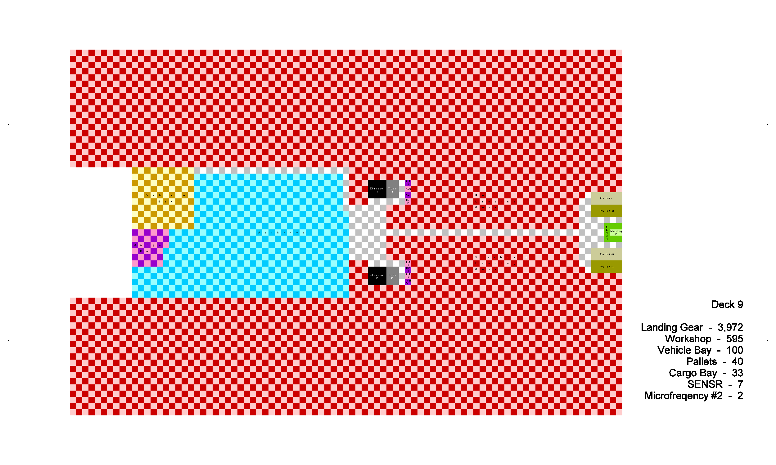 | Deck 9 contains 4 Mk.30 pallets (facing forward) and the backup Microfrequency radio. Part of the forward SENSRs, part of the landing gear, part of the workshop, part of the vehicle bay and part of the cargo bay are located on this deck. |