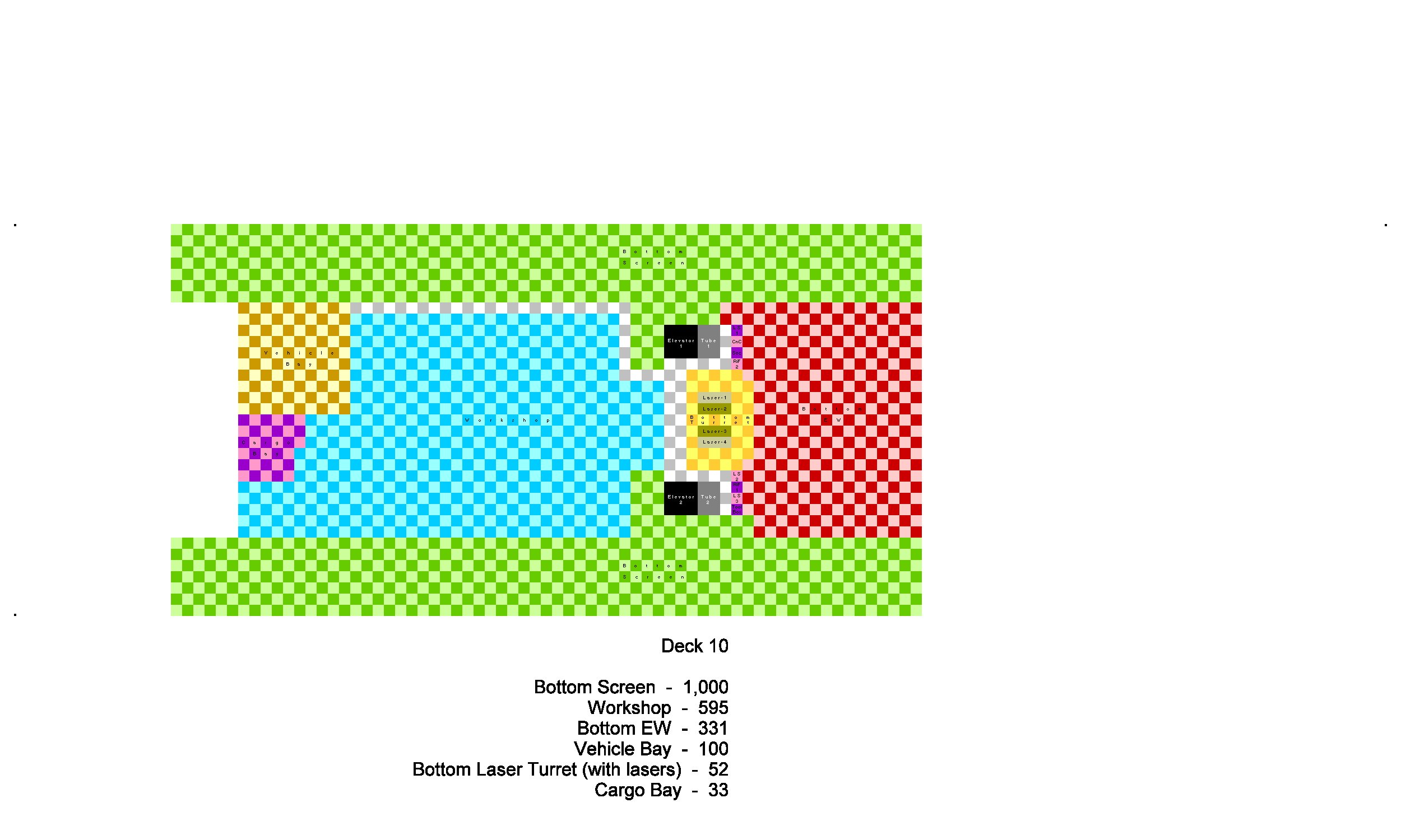 | Deck 10 houses the bottom turret, containing 4 Mk.10 lasers with a 360° arc of fire, the bottom Screen generator and the bottom EW generator. Part of the workshop, part of the vehicle bay and part of the cargo bay are located on this deck. |