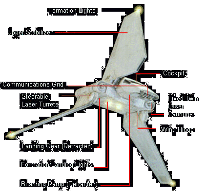 The Lambda is used to transport both cargo and personel. It's heavy armament makes it capable of travelling without escort. Also this vessel has rather powerful shields. The Lambda is designed by Sienar Fleet Systems but Cygnus Space Works has provided a more heavily armed version. Many government officials use the Lambda Shuttle for personal transport due to their combination of ability in combat and the large interior cargo area which could be converted to passenger space. Also the shuttle's multiple shield systems and strong hull increase its survivability in combat.