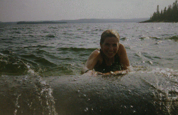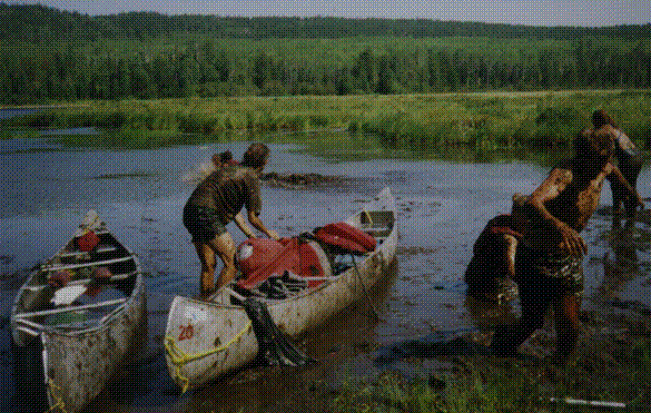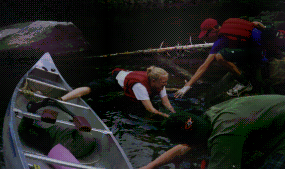 This was on our first day of expedition, and our first portage. We were all new and didn't know what to expect, so we tried very hard not to get our feet wet(later though we didn't much care). When getting out of the canoe, the boat pushed out from shore, and Devan here is in the splits. It's a good thing she does ballet!!