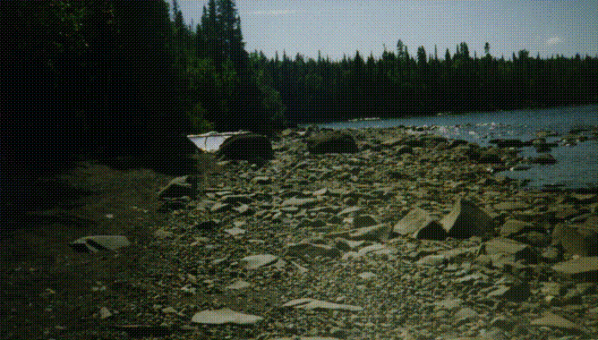 Also on the first day of our 12 day expedition, we couldn't find our last portage(after that portage we were going to set up camp, so we were all very tired 'cause we'd done 3 portages before this, which were very difficult, and on top of that during one of the portages, we hit a bees nest and a member of the group got stung 4 times)and it was getting dark, so bushcrashing would be dangerous. We ended up setting up camp right there, which turned out to be a spot with LOTS of dry wood for the fire. Anyways, the next morning we still couldn't find the trail, so we took the long way and spent the whole day carrying our canoes down a small river(above pic). Sometimes we hit some waist deep fast moving water, which was really cool. I got my first bee sting of my life this day, and I didn't even know it!