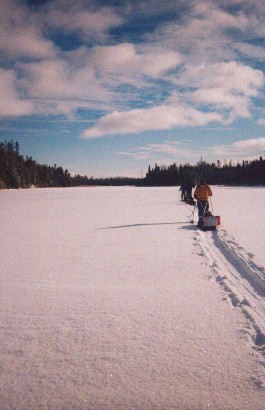 Well, because I enjoyed the summer OB course so much, I decided that I wanted to do a winter course as well. So, summer 1998, when I did the summer course, until Nov. of 1999, I saved up enough money to take the Northern Ontario Winter Experience OB course(Thunder Bay, Dec.26th-Jan 2nd). It was, again, amazing. I learned how to dog-mush, pack for ski expediting, make a winter fire, sleep with nothing but a tarp over my head and 2 sleeping bags, keep warm when its frickin' cold(which it was), and so much more!! I really enjoyed myself. The best part was that there were only 6 of us on the trip as opposed to the 11 I had during the summer. This allowed for our group to get to know eachother much better. Our instructors, Ian and Lisa, were fantastic. Anyways, check out the pics below, from yet another OB adventure. Cheers!