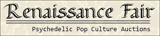 Catalog #6 - Winter/Spring 2013 Auction & Set Sale After an 18-month hiatus, brought on mainly by the massive work involved with my recent Psychedelia book, the Renaissance Fair is now again open for business. As always, List #6 is a mixed bag of set sale and auction items. This time we have gathered a bundle of custom pressings never offered on these shores before, and a selection of rare music fanzines alongside the classic psychedelic paraphernalia. If a new customer, please read the general information before jumping into the action. Enjoy the list & stay high! ~ Patrick Renaissance Fair catalog items fall into two categories; Auction and Set Sale. Set Sale items are available to the first buyer, as usual. Auctions are listed with a Minimum Bid (MB), where the bidding starts. Auction items may be sold immediately, if an attractive enough offer is made. If the item is not flagged as 'Sold', the auction is still open and bids are invited. As the auctions proceed, the current bid levels will be updated to reflect the most recent bids. Don't wait too long with bidding, since many auction items are sold in a matter of a few days. If the item price is not prefixed by 'MB', it is Set Sale and available for immediate purchase at the price listed; first come, first served. Prices are shown in both Euro and US dollars. The base price is US dollar, from which Euro prices were calculated in February 2013. The Euro price may be slightly adjusted at the time of a transaction, depending on changes in the currency exchange rate. Contact us to order, bid or inquire. Please specify items clearly, including item number. For business details and a description of our grading system, see the ordering info page. The grading format for vinyl records is Disc / Cover. All records have been played in their entirety before setting a grade. |