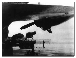 Mounted on the rear of a truck, a jet engine from an F-80 Shooting Star is used in Berlin after a recent snowstorm to melt ice and snow from the wings of U.S. Air Force C-54's at Tempelhof Air Force Base. The hot blast from the engine quickly removed ice or snow from Berlin airlift planes, saving valuable time.