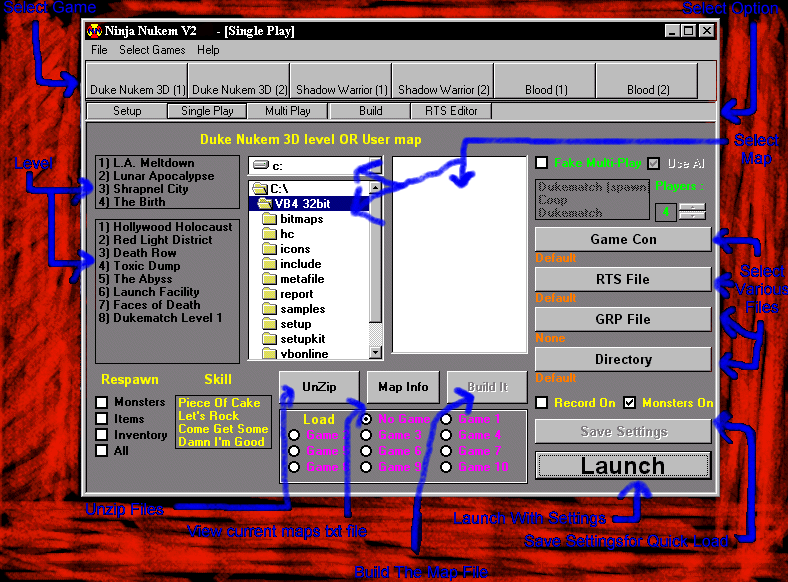 This is a shot of the single play options for Duke Nukem 3D, there are different options for different games