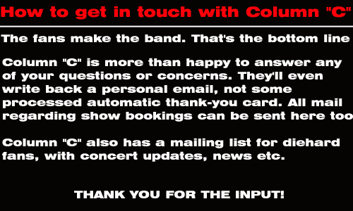 Send all questions, comments, and love poems to: columnc@hotmail.com If you want to get on the Column "C" mailing list, which will give you up-to-date show listings, news, events and release information, click here and write "Mailing List Subscription" in the subject. |