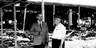 Camille struck at night. The full force of the storm was felt all along the Mississippi Gulf Coast between 9pm and 2am the following morning. The storm moved quickly northward away from the Coast. The high winds and seas subsided soon after. The next morning was calm, bright and sunny, allowing "stunned" residents and rescue workers to emerge from homes and/or other locations to begin surveying the damage. End of text added.) According to a part of the Encyclopedia Britannica, which may need rewriting, Biloxi Mississippi is a "year-round" resort with more than the usual seaside and country sports. It is hard to comprehend, said Ralph Godwin, the Mississippi American Legion's National Executive Committeeman, that "Hurricane Camille last August 17th did not damage or destroy the best of Biloxi's year-round resort, it erased it, so that much of it does not exist and will not exist again." The same can be said for much of Gulfport, Bay Saint Louis, Pass Christian and other Mississippi communities, as well as Buras, Louisiana, and other Louisiana Delta and East Gulf towns. (Note: Text added. Water some 27 feet above normal sea levels in places rushed inland as Camille came ashore. On top of the huge surge, the highest ever recorded in the United States, wave heights reached 30 to 35 feet battering everything in their path. This picture shows remnants of homes and businesses on the Pass Christian side of the Bay of Saint Louis Bridge. Following Camille, all of the water in the Bay of Saint Louis was covered with the floating debris of homes, businesses, and other structures. (End of text added.) |