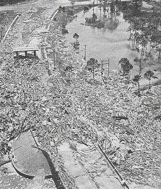 Camille struck at night. The full force of the storm was felt all along the Mississippi Gulf Coast between 9pm and 2am the following morning. The storm moved quickly northward away from the Coast. The high winds and seas subsided soon after. The next morning was calm, bright and sunny, allowing "stunned" residents and rescue workers to emerge from homes and/or other locations to begin surveying the damage. End of text added.) According to a part of the Encyclopedia Britannica, which may need rewriting, Biloxi Mississippi is a "year-round" resort with more than the usual seaside and country sports. It is hard to comprehend, said Ralph Godwin, the Mississippi American Legion's National Executive Committeeman, that "Hurricane Camille last August 17th did not damage or destroy the best of Biloxi's year-round resort, it erased it, so that much of it does not exist and will not exist again." The same can be said for much of Gulfport, Bay Saint Louis, Pass Christian and other Mississippi communities, as well as Buras, Louisiana, and other Louisiana Delta and East Gulf towns. (Note: Text added. Water some 27 feet above normal sea levels in places rushed inland as Camille came ashore. On top of the huge surge, the highest ever recorded in the United States, wave heights reached 30 to 35 feet battering everything in their path. This picture shows remnants of homes and businesses on the Pass Christian side of the Bay of Saint Louis Bridge. Following Camille, all of the water in the Bay of Saint Louis was covered with the floating debris of homes, businesses, and other structures. (End of text added.) |