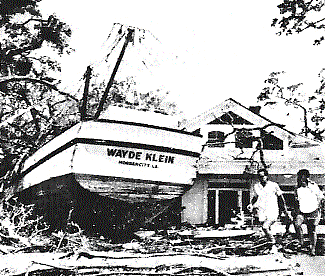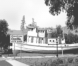 the Florida Keys. In the hardest hit areas along the lower Louisiana peninsula and Mississippi, more than 5,000 homes were totally destroyed with 40,000 damaged. Storm tides of 20 and 30 feet were so high that one survivor was washed over the City of Pass Christian without encountering any utility poles, buildings, or trees. "After landfall, Camille weakened steadily as it moved on a curving path through Mississippi, Tennessee, Kentucky and West Virginia," recounted William Proenza, director of the NWS Southern Region. "The heavy rains normally accompanying a dying hurricane diminished from nearly eight inches in southern Mississippi to one to two inches in eastern Kentucky as the tropical depression passed through," he said. The minimal rainfall was expected to continue on August 20th as the storm proceeded on a course through West Virginia and into central Virginia. The state of Virginia counted 113 dead with 39 missing with total damages amounting to more than $116 million ($534 million in 1997 dollars). The floods, rain-induced landslides, and property damage indicated that this event was the worst natural disaster ever to strike the state. Camille's total damage was estimated at $1.4 billion at the time ($6.45-billion in 1998 dollars). "Camille caused emergency managers to rethink ways to reduce storm fatalities," said Jerry Jarrell, director of NOAA's National Hurricane Center in Miami. End of text added.) (Note: Bottom left picture and this text added. After Camille, a Tug Boat washed up on the shore North of Route 90 in Gulfport. Later, it was turned around, strongly mounted, and converted into a Gift Shop. It remains there today as a steadfast reminder of Hurricane Camille, to anyone walking on the sidewalk or driving East or West on the Beach Boulevard. Located in a tug boat that washed ashore during Hurricane Camille in 1969, this unique store carries a huge selection of Gulfport and Gulf Coast souvenirs and memorabilia. If you're visiting the Gulf Coast, stop in and visit...and the folks there will be happy to tell you more about Hurricane Camille and the history of the Gift Shop. If you have any Camille memorabilia, it would be nice if you would consider donating it the the Hurricane Camille Gift Shop. The Camille Gift Shop is located at 3700 West Beach Boulevard, Gulfport Mississippi. The Gift Shop's phone number is 1-228-864-5284. Stop in and browse around for awhile. |