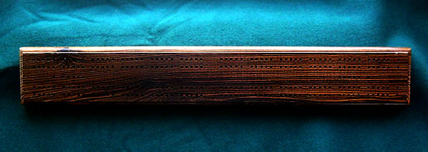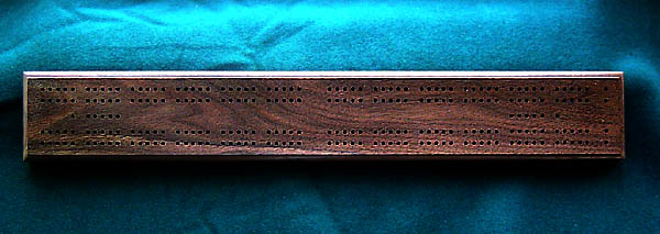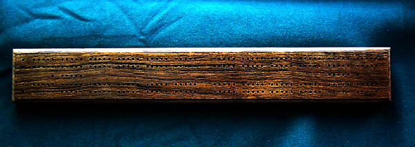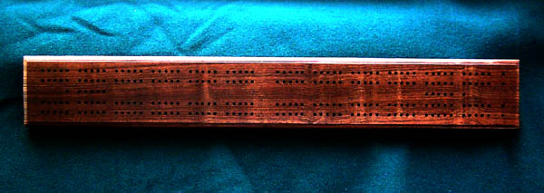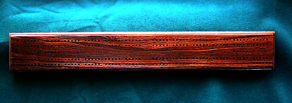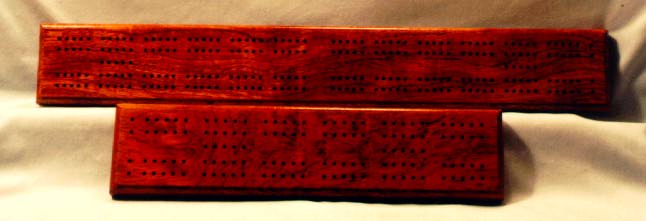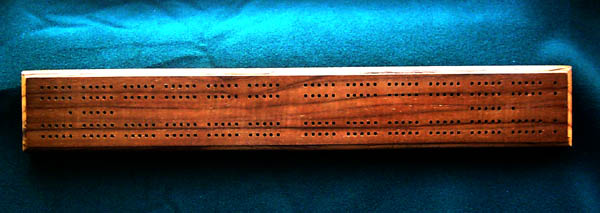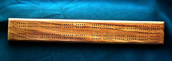 Here comes Christmas, and what am I doing? I'm still making sawdust and spraying finish on a load of cribbage boards. I have recently finished boards made from bloodwood, canary wood, and elm among others. Please check with us to see what is done and what is about to be finished.Shipping a tourney board in the continental US is $7.00, a short board is shipped for $6.00. Orders from outside of the continental US take a little longer and cost a little more to ship but are possible. I recommend contacting me via email, or calling, to find out if the board you are looking at is still available, sometimes the board is a one of a kind. All two track boards come with 6 wooden pegs, and optional brass pegs gold and silver tone are available for $3.00 for a set of six with a board and $5.00 without a board. Previous customers are eligible for the discounted price.