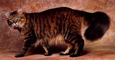 The Maine Coon Cat is known for its large size, easygoing temperament, intelligence, and rugged appearance. This native New England breed is well-adapted to the region's harsh climate, with a heavy, shaggy coat, bushy tail, and tufted ears and toes. Despite its name, the Maine Coon cat is not a relative of the raccoon (legends to the contrary notwithstanding). Its glossy coat is heavy and water-resistant, and like that of no other breed, and must be felt to be truly appreciated. Its big, round, tufted feet serve as snow shoes for moving through deep snowdrifts.