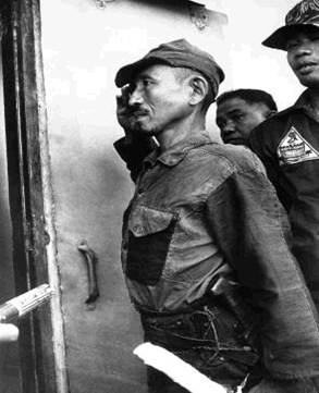 Hiroo Onoda, wearing his 30-year-old Imperial Army uniform, cap and sword, salutes to the Philippine Air Force on arrival March 10, 1974 at a radar site on Lubang Island, Philippines when he comes out of hiding. |