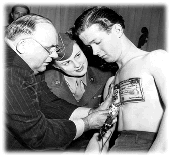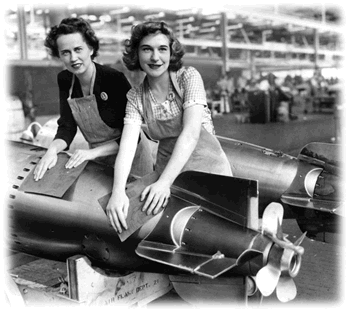 Amertorp Torpedo Ordance Corporation in Forest Park, Illinois. The image of a war bond is tattooed on a mans chest. 1945 Up to 6,500 workers made hundreds of torpedoes a month. 1943