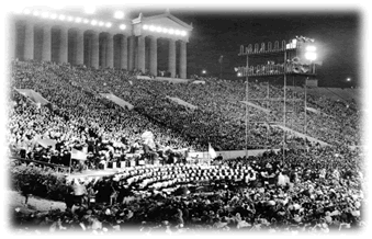A Chicago arms plant in 1944. A crowd attends a Hollywood Bond rally in Soldier Field. 1943