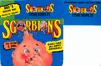 STICKER PACK TYPE: PAPER WRAPPER WRAPPER ARTWORK TOM BUNK DAGLI USA GLI UNICI ORIGINALI = FROM THE USA THE ORIGINALS CONTAINS 5 STICKERS +5 SURPRISE PIECES COLLECTION of EXAGGERATED CHARACTERS N.1 ![]() STICKER ALBUM SIZE: 8.5 x 12 INCHES MAIN ALBUM ARTWORK TOM BUNK STICKER IMAGES JOHN POUND NOTE: ADVERT ON BACKSIDE COVER FOR SGORBIONS N.2 ![]() SEALED STICKER ALBUM SIZE: 8.5 x 12 INCHES £. 2000 NEWSSTAND INSERT SONO ARRIVATI DAGLI U.S.A. = THEY'VE ARRIVED FROM THE U.S.A. SCOPRI CHI SONO! = FIND OUT WHO I AM! CON L'ALBUM E LE 2 BUSTINE = INCLUDES ALBUM AND 2 PACKS APRI E VEDRA! = OPEN AND SEE! NOTE: IMAGE PROVIDED BY GPKTILLDEATH ![]() PROMO PACK WRAPPER BACK INSERTED W/IN SEALED ALBUM WRAPPER ARTWORK TOM BUNK OMAGGIO = FREE NOTE: IMAGE PROVIDED BY GPKTILLDEATH ![]() NEWSSTAND PACK HANGING DISPLAY WRAPPER ARTWORK TOM BUNK RENDERED LOGO ARTWORK UNKNOWN NUOVI STICKERS = NEW STICKERS NOTE: IMAGE PROVIDED BY GPKTILLDEATH ![]() SPECIAL T-SHIRT OFFER T-SHIRT ARTWORK TOM BUNK NOTE: PACKAGED WITH MEGA/HOLIDAYS ALBUM ...COCCOLAMI..! = ...CUDDLE ME..! OFFERTA SPECIALE! SOLO L.10.000 = SPECIAL OFFER! ONLY $15 ALBUM: C'E UN SUPER REGALO PER TE! = THERE IS A SPECIAL GIFT FOR YOU! LA FAVOLOSA T-SHIRT DEGLI SGORBIONS = A FABULOUS SGORBIONS T-SHIRT NOTE: AN ADVERT IS LOCATED ON BACKSIDE OF SGORBIONS N.2 ALBUM NOTE: IMAGE PROVIDED BY GPKTILLDEATH |