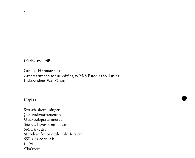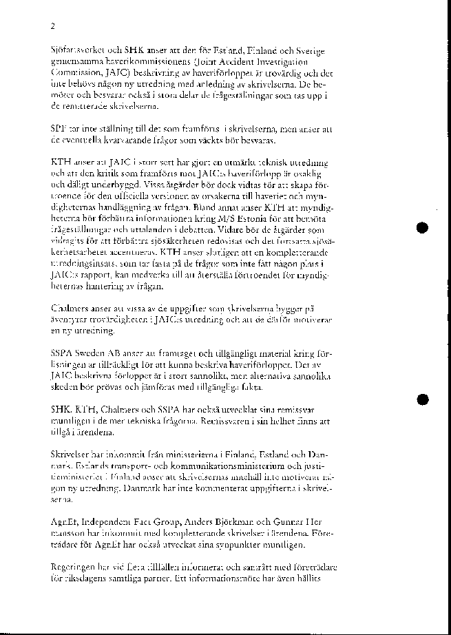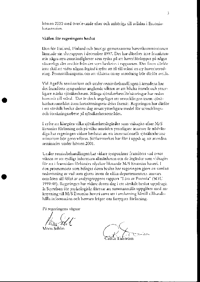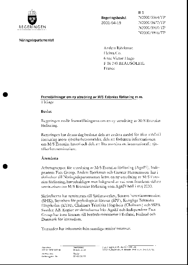 Vad kan man säga om ovan svenska regeringsbeslut 2001 04 19 signerat av Mona Sahlin om Heiwa Cos uppgifter? Att - 'Vi kan inte åstadkomma sanningen, utan vi kan åstadkomma förtydliganden, bättre struktur på den information som finns. Sanningen i förfluten tid är alltid svår att åstadkomma och den kräver att man har fullständigt underlag på alla punkter och sådant fullständigt underlag finns inte' som Björn Körlof, generaldirektör för Styrelsen för Psykologiskt Försvar , sade 23 april 2001 i Sveriges Radio? Man frågar sig om de som skrivit remissvaren har läst Heiwa Cos uppgifter överhuvudtaget? En majoritet av dem är jäviga - de var antingen med om att utreda olyckan eller är rädda för att uppgifterna skall avslöja brister hos förvaltningen. Sjöfartsverkets remissvar har skrivits av Franson och Selén 1.16. Sjöfartsverkets personal har ej tillfrågats om Heiwa Cos observationer i t.ex. 1.23 och 1.33. Franson och Selén anser inte att det behövs någon utredning med anledning av Heiwa Cos uppgifter. SHKs remissvar har skrivits av Eksborg och Huss 1.5. De anser att Kommissionens (JAIC) beskrivning av haveriförloppet är trovärdigt och har tydligen inte studerat 1.9. KTHs remissvar har skrivits av professor Olle Rutgersson som tydligen anser att Kommissionen (JAIC) i stort sett har gjort en en utmärkt teknisk utredning. Han har tydligen inte läst ett enda ord av Heiwa Cos observationer. SSPA Sweden AB anser att framtaget och tillgängligt material kring förlisningen är tillräckligt för att kunna beskriva haveriförloppet. SSPAs rapport kan ses i Appendix 2. SSPA anser att Kommissionens beskrivna förlopp är i stort sannolikt. Chalmers anser att vissa av de uppgifter (som inlämnats) ... äventyrar trovärdigheten i Kommissionens utredning men specifierar ej dessa 'vissa uppgifter'. Regeringens uppfattning är dock att "Det har ... inte framkommit några nya omständigheter som tyder på att haveriförloppet på något väsentligt sätt avvikit från det som beskrivits (av Kommissionen)". Men regeringen har dock avsatt medel (SEK 25 miljoner) för utvecklings- och forskningsarbete på sjösäkerhetsområdet som skall fördelas av Vinnova (Styrelsen för innovationssystem). Det är utmärkt - en bråkdel av dessa medel kan användas av studenter i risk- och safetymanagement och konfirmera Heiwa Cos uppgifter. Tyvärr har Vinnova 2001 redan försnillat de 25 miljonerna - utdelade till olika mörkläggare av Estoniaolyckan! Ganska otroligt. Regeringen har också beslutat att Sjöfartsverket skall genomföra ett internationellt sjösäkerhetsseminarium under hösten 2001 för att klargöra på vilka områden ytterligare insatser är nödvändiga. Det är utmärkt - det är naturligtvis nödvändigt att studera Heiwa Cos uppgifter för att förbättra sjösäkerheten. Slutligen har regeringen beslutat att Styrelsen för psykologiskt försvar, SPF, skall sammanställa uppgifter med anknytning till M/S Estonias haveri. Det är utmärkt - Heiwa Cos uppgifter är fritt tillgängliga på Internet och SPF får gärna länka till dem när de tillhandahåller information och besvarar frågor om fartygets förlisning. Heiwa Co kommer ej att besvara Regeringens brev utan tackar här för det. Heiwa Cos uppgifter på Internet får tala för sig själva. Tillägg 14 november 2020: Mona Sahlin meddelade i regeringsbeslut 2005 att det plötsligt finns oklarheter kring olyckan, dvs nya omständigheter, bla, bla, bla! Tillbaka till Heiwa Co start