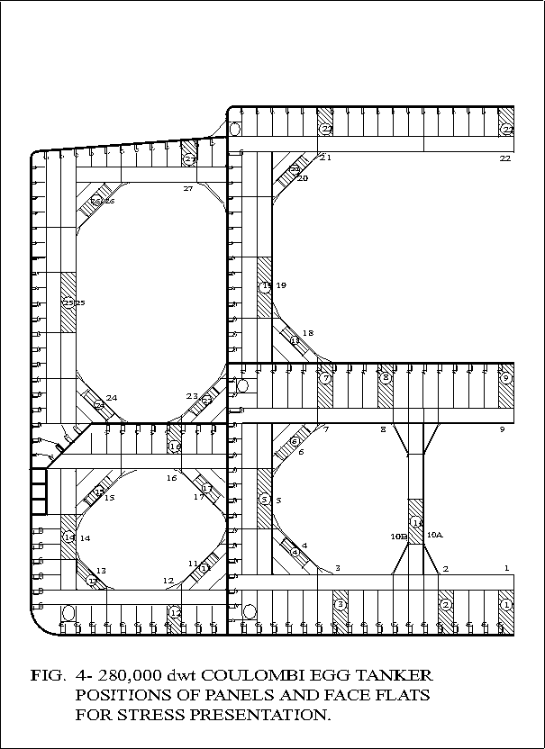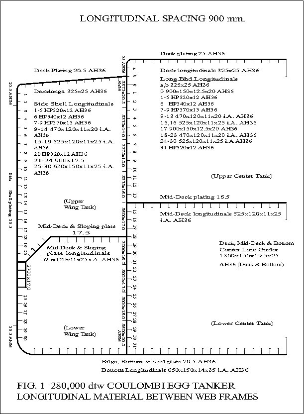 The tank body can be broken down in building blocks as shown in Fig 5 (not included here but described as follows: the bottom of the lower centre tank + long. bhds is the first block. The bottom of the upper centre tank + long. bhds is the second block . The lower side tank (three panels) blocks P+S are the third and fourth blocks. The upper centre deck + long.bhds is the fifth block. The top side tank (two panels) blocks are the sixth and seventh block). Each block consists of flat plate panels with stiffeners and rectangular open webs adapted for fully automatic fabrication and welding in panel and web lines. Corner brackets are fabricated in a separate line. The full width mid-deck is a very good platform for erection welding and dimensional control, and application of coatings to the upper wing ballast tanks can take place during block assembly or after assembling the blocks in the building dock. Safety aspects Cracks and fractures of various types always occur in a tanker structure, but operators must ensure that they do not occur in the oil/ballast boundary structure, to avoid cargo leaks into the ballast spaces. The COULOMBI EGG tanker will perform very well here as the structure concerned - the upper part of the longitudinal bulkhead - is minimally stressed and is not subject to corrosion either too difficult to control or too aggressive. If a leak occurs, it is easily spotted, and oil will collect in the outboard corner of the ballast tank from where it can be transferred to another tank. Environmental protection The Egyptian maritime administration has agreed to sponsor a submission to the 34th MEPC session from 5-9 July 1993 to the effect that the COULOMBI EGG tanker be accepted according to regulation 13F as an alternative design to a double bull. In a comparative study, it was shown that three sizes - 50 000dwt, 150 000dwt and 280 000dwt - of COULOMBI EGG tanker have much lower mean and extreme outflows in accidents than reference double-hull tankers. (Note - the IMO delayed its approval of Guidelines to approve alternative designs until 1995 and then Sweden accepted to sponsor the submission. Approval by the IM0 was not until September 1997 thus four years after this article was published). The reason for this is that grounding protection is provided by the side-to-side mid-deck which effectively reduces outflows to very low figures if the bottom shell is breached. Collision protection is provided by the patented COULOMBI EGG system, which takes into account the non-uniform probability of side damage in collision. It is a fact that deep penetration of the side is more frequent above the waterline, where the COULOMBI EGG tanker has B/5 wide wing tanks and more structural protection than a 2 m wide double side shell. The B/5 wide main deck can absorb a substantial amount of collision energy. The lower 0.25D part of the side is protected by an automatic cargo transfer system. When there is a hole in the lower side, the inflowing water pushes up cargo oil into the access trunks of the lower wing tanks and from there, it flows, through air, to an undamaged upper wing ballast tank on the other side. This overall combination of grounding and collision protection bas been shown to provide superior protection than a 2 m wide reference double hull. Cargo operations The COULOMBI EGG tanker is very suitable for handling three grades of cargo by free flow in the natural segregations provided by the upper and lower cargo tanks. Cargo suction piping is not necessary and three pumps can take direct suction from the aft most tanks. Another cost-effective situation is to use electric driven deep well pumps: four in the upper centre, four in the lower centre and one each in the lower wing tanks. Such an arrangement saves energy during discharge as the cargo in the upper centre tanks only need to be lifted half the tanker's depth. Then all cargo piping is on deck! Tank cleaning of the lower tanks is accomplished by submerged machines. The structural arrangement in the lower centre tank with its rather narrow side webs and two slender struts means that only five or six machines are required for 100% direct washing coverage of the whole structure. Tank cleaning is similar to a single-hull tanker. Operational draught limitations have been mentioned earlier. Clearly, the arrangement with upper and lower tanks requires a new understanding of cargo planning - the order of loading and discharging cargo parcels and the distribution of cargo differ from a conventional double or single hull with full depth tanks. Stability Intact stability is always in order under normal condition numbers 1-12 (Fig 3). Damage stability is also in order. There are no ballast spaces in the tank body adjacent to the bottom to be flooded in grounding, so the analysis is very simple. In part-loaded conditions, an operator may flood a lower cargo tank, but the COULOMBI EGG tanker should always survive, according to the regulations. Beginning of a new era The new Marpol 73/78, regulation 13F, which allows alternative designs to double hulls, is the challenging beginning of a new era. To develop a new tanker is not easy, considering the total influence of any one modification on the structure, fabrication, safety, environmental protection, stability, ease of maintenance and operation of tankers of various sizes. The original COULOMBI EGG vessel was conceived in 1989 and has since evolved with the side cofferdam, the sloping mid-deck at the side, a mid-deck in two levels, the trunked deck design to locate the main deck at the side to act as a fender to absorb collision energy, and the automatic wing tank cargo evacuation system which handles holes in the side. Production costs should not differ too much from a single-hull tanker, although there is approximately 10% more steel in the tank body, which might add 4~5% to the initial cost. Underwriters must appreciate the reduced risk that a COULOMBI EGG tanker offers compared with d