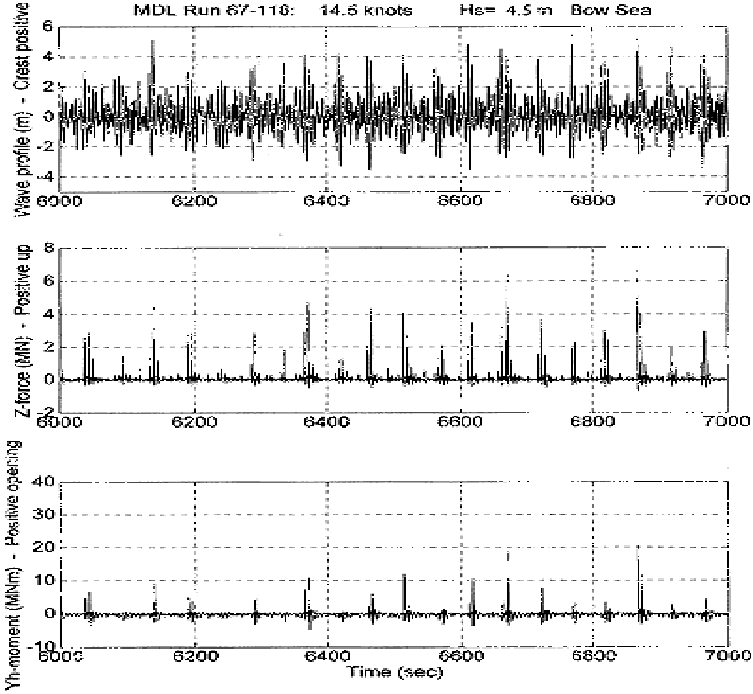 Figure 3.7.1 - Figure 12.3 in (5) Example of time series from model tests The Commission thus suggests that a vertical impact force (P - figure 3.2) of 360 tons (3.6 MN) pulled open the Atlantic lock at about 00.55 - 01.05 hrs - it might also have been the port hinge or a side lock that broke first even it the former did not carry any load, when the Atlantic lock was intact, and the latter was in compression, when the Atlantic lock was intact. Frequent Impact Loads - but with little Energy There is evidently no evidence for a sudden impact load on the visor causing a force breaking the Atlantic lock. The model tests above show that there were impacts on the visor causing a vertical Z-force >400 tons every third minute and >300 tons every minute. But AB Linde had heard only one big 'bang' - the 360 tons impact? - sometime before 01.00 hrs and then it was quiet for five minutes. Most passengers only heard two big, sharp bangs and then there was a sudden listing. But the model tests show clearly that there were wave impacts of >300 tons every minute! What shall we believe? The evaluation of the model tests is apparently manipulated, i.e. when extrapolating the full scale Z and X forces from the model tests. How the impact load was transmitted via the locks and hinges to the hull is not known and never explained. There were unknown wear and tear in all attachments but the five attachment points should however, in the writer's opinion, have easily transmitted impact loads to the supporting structure because of their short duration. There was never enough energy in the impacts to damage the locks. And evidently, if there were not enough energy in the impacts to damage the locks, there was not enough energy to lift the visor itself up from the supports. If there were enough energy to lift the visor up from its supports, the same energy would ensure that the visor came crashing down on its lower supports, resulting in a lot of damage to the hull: but the forepeak deck 2 on the wreck below the visor is completely undamaged.The Commission suggested, as one possibility, that it was the Atlantic lock that was pulled apart in tension first. The Commission assumed that the Atlantic lock was in perfect and undamaged condition before the accident, even if there is no evidence for that.