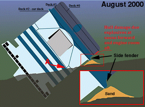 Media har rapporterat om två hål i blåmålade skrovet under däck #2, men när estniska och svenska experter undersöker på plats (havsbotten), anger de att skadorna är lokaliserade i vitmålade däckshuset vid livbåtsdäck #7 >20 meter högre upp?! nertryckt i leran. Och att skrovet är också täckt av lera!! Tänk vad man hittar på. "De två hål som filmats av dokumentärfilmare, varav det ena visats i en TV-dokumentär, bekräftades och dokumenterade med svepsonar och kamera. I anslutning till hålen finns ett antal sprickor i skrovet och mellan hålen finns en längre intryckning i skrovet som bedöms vara drygt 20 meter lång." Men esterna har också meddelat andra skador på skrovets styrbordssida strax ovan lerbotten! First dive! - "The survey continued on the starboard side of the wreck, moving near the mudline towards the bow: 44.20 Because the first dive was performed higher (most of the hull damage on the starboard side is below the hull curvature), the hull damage on the stern side is not visible. The starboard stabilizer fin was inside the hull (not in the extended position): 55.00 The reinforced board part surrounding the stabilizer fin is more corroded than rest of the hull and the welds are covered with a thick layer of rust." Utom tvivel har esterna filmat styrbords sprängskador däck #0 ovan "mudline" vid maskinrummet akterut och saunan förut, även om rapporten sedan är redigerad/förfalskad! En fotodokumentation som genomfördes av MS Estonia under sommaren 2022 resulterade i ca 45.000 fotografier. Ett arbete pågår för att sätta samman fotografierna till en 3D-modell genom att använda fotogrammetri. Resultatet bedöms kunna publiceras i slutet av januari 2023 av Statens Haverikommission. Fokus Estonia (en grupp privatspanare) - Björn Arvidsson, Johan Ridderstolpe, Lars Ångström, Anders Ulfvarsson, Roland Karlsson och Inga Britt Ahlenius reagerar inte. De tror inte på sabotage som jag och kan inte ens nämna möjligheten. Jag undrar varför. Men Lars Ångström har 221103 meddelat mig att Fokus Estonia kommer snart med ett nytt reportage. De tror istället på en mystisk, osannolik spricka i vita överbyggnadens styrbordssida ovan däck #2, som vi inte vet var den börjar eller slutar och hur den uppstod: ![]() Bilden/animationen ovan är en förfalskning av korrupta svenska journalister att skydda terrorister! Mer om dem nedan. För en skrovspricka ser inte ut som på bilden. Jag har personligen letat efter sprickor i oljetankfartyg i >30 år och vet hur en spricka i ett stålskrov ser ut. Faktagruppen, IFG, har andra synpunkter var "skadorna" finns enligt nedan: De säger: ... " ![]() Faktagruppen tror att första skadan (sprickan) är ett hål (?) i överbyggnaden runt däck #2. IFG har inte fattat att skadan är i saunan däck #0 fyra meter under vattenlinjen. IFG tror också att den andra skadan är ett annat hål under däck #2 vid stabilisatorn i vattenlinjen, fast den är i maskinrummet akterut däck #0 fyra meter under vattenlinjen. Osv! Jag deltog 1990 i en IMOgrupp (IMO = FN's sjöfartsorgan) i London att förbättra skydd mot oljespill till sjöss, pga kollisioner och grundstötningar med oljetankers efter Exxon Valdez olyckan 1989. Jag arbetade sedan 1980 för en stor oljetankerredare i Monte Carlo, Monaco. Vi fann, bl.a, att 80% av alla oljetankerkollisionsskador med oljeläckage som följd var lokaliserade enbart över vattenlinjen! IMO antog att hela sidan revs upp från skrovbotten till högsta däck. Vi gjorde ett bättre jobb! Vi studerade 100-tals kollisioner. Men tyvärr skulle vi inte utreda oljespill, pga sprickor och konstruktions/svetsfel! Ordförande i IMO-gruppen var 1990 svensken Börje Stenström som oktober 1994 utsågs att utreda Estoniaolyckan som medlem av JAIC och svenska Statens Haveri Kommission, SHK. Vi träffades i slutet av oktober 1994 i London och jag meddelade Börje att färjor som Estonia inte flyter på bogvisir i överbyggnaden, etc, etc. Jag hade faktiskt följt olyckan redan från morgonen på mitt eget skepp på provtur i Medelhavet med satellitTV, mm och kunde följa nyheterna från Östersjön. Min redare och jag skötte, förutom oljetankers, nämligen färjor typ Estonia i Medelhavet och Röda Havet och vi hade snabbt utrett olyckan själva. Färjan Estonia var inte sjövärdig med falska certifikat, värdelös livräddningsutrustning, olagliga vattentäta dörrar/skott i skrovet, som alltid stod öppna, mm, när olyckan/sänkningen skedde, pga sabotage. Estonias redare och verksamhet var rent kriminella och understödda av svenska staten! Börje blev inte glad att höra det. Han hade ju just blivit utsedd att mörklägga och ljuga om allt om Estonias sänkning, pga sabotage av terrorister och hade beslutat/blivit ombedd av statsminister Carl Bildt att skylla på vågsmällar på visiret, som ingen noterade, när det trillade av! Annars var Estonia-färjan i perfekt skick enligt JAIC/SHK & Co. Jag hade själv besiktigat "skiten", när färjan var till salu efter redarens (Algot Johansson/Sallys) konkurs omkring 1992 och visste att färjan var åländskt "fusk" alltsammans! Läs gärna min böcker Katastrofutredning och Estoniabluffen som jag skrev för länge sedan om JAICs mörkläggning. Dessa böcker har sänts till Riksdagens ledamöter och andra berördra parter. De är allmänna handlingar. Men det mesta som SHK, Sjöfartsverket, Försvarsmakten, m.fl, meddelat om Estonia sedan 1994 är idag sekretessbelagt enligt svensk Offentlighets- och sekretesslag (2009:400) - 17 kap. Sekretess till skydd främst för myndigheters verksamhet för inspektion, kontroll eller annan tillsyn om Undersökningar av sjöolyckor och tillbud, m.m. 4 c § Sekretess gäller för uppgift som hänför sig till myndighets verksamhet som avser undersökningar av sjöolyckor eller tillbud till sjöss eller preliminära bedömningar av allvarliga sjöolyckor enligt lagen (1990:712) om undersökning av olyckor, om det ka