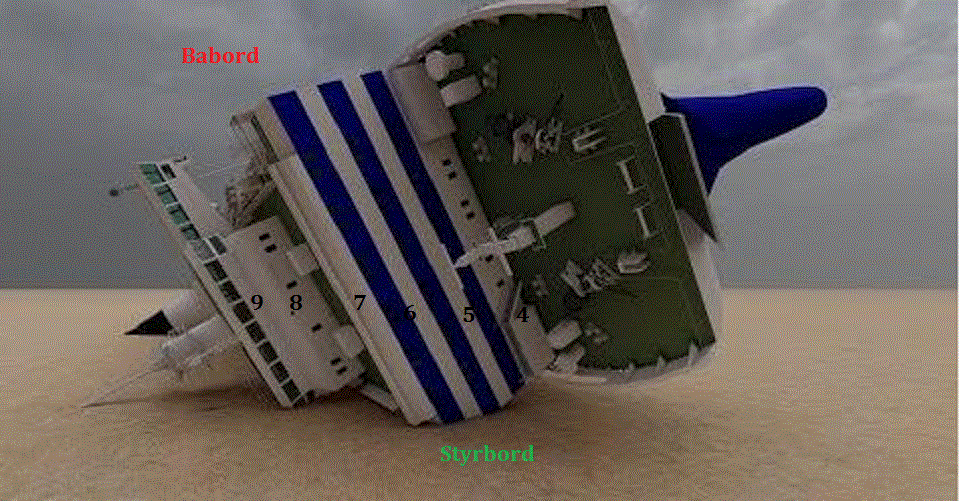 Estonias skrovs styrbordsutsida är blåmålat under bildäck #2 och delat vattentätt av tvärskott (som inte var vattentäta! Estonia var fuskbyggd!). Skada #1 är vid maskinrummet akterut och skada #2 vid saunan förut, där besättning och passagerare noterade läckagen. Det vore intressant att veta vid vilka spantnummer skotten sitter. Spant #0 är aktra perpendikeln. Ovan det vattentäta skrovet sitter en vitmålad, vädertät överbyggnad och ovan däck #4 sitter däckshuset med sina fönster. SHK skall hösten 2022 visa bilder att skrovet är oskadat. Om nu uppgifterna blir tillgängliga. Vilket aldrig kommer att ske! Abolition! Försvarssekretess! I Sverige är Estoniasabotaget en avslutad historia eftersom en kriminell, svensk regering beslutat det. Visiret trillade av och det var tyska varvets och estniska kaptenens fel. Osv, bla, bli, håll käften, mm. Ett par svenskar filmade Estoniavraket 2019 på havsbotten och noterade skador i överbyggnaden. Ett TV reportage 2020 blev resultatet. SHK beslöt då att dyka själv 2022 och verifiera uppgifterna. SHK hittade inget (!?) av intresse uttom två hål. Esten Margus Kurm beslöt att dyka själv redan 2021 sponsrad av estniska media. Kurm kontaktade mig om var skadorna fanns. Resultatet av Kurms dykning 2021 är hemligt 2022!! Jag antar att Kurm hittade sprängskadorna i skrovet som sänkte Estonia 1994, och som nu estniska AIB dokumenterar igen, innan svenska SHK presenterar nya förfalskningar hösten 2022! Var är dessa två hål i skrovet? Spant nummer #, däck #, däck #0 är innerbotten under vattenlinjen, däck #8 är kommandobryggan högst upp i däckshuset, plåtstråk #, etc. Ingen vet! Vad finns innanför skadorna? Maskinrum, sauna, hytter, tankar? Allt är oklart. När och hur upptäcktes de två hålen och av vem? Finns riktiga bilder, foton?? Vilken typ av hål är det? Sprängt inifrån ut? Kontakt utifrån in? Plåtspricka i bordläggningen med sidorna flyttade ut/in och med läckage imellan, pga utmattning? Storlek? Plåttjocklek? Orsak? Korrosion, utmattning, yttre påverkan?? Ingen ansvarig vet utom att det skall klargöras igen. Av samma JAIC/SHK gäng som mörklagt rubb och stubb sedan 1994 med uppgiften att skrovet är oskadat och visiret trillade av. Vilken show/uppvisning! Och vilken urusel mediabevakning! Enligt svensk och estnisk lag är all undervattensverksamhet vid Estoniavraket/graven förbjuden, vilket kontrolleras av finsk gränsbevakning. Nu är vraket/graven obevakat sedan länge och besökare kan göra vad de vill på platsen. Svenska åklagare godkänner den brottsliga verksamheten i vanlig oordning. Det finns tydligen mera skador i skrovets styrbordssida! Massor av mystiska hål! Men var? Däckshuset skadat!! Enligt estniska uppgifter juni 2022 handlade det om vita däckshuset däck #6/8 (!) av tunn 5 mm plåt ovan överbyggnaden (däck #2/4) och skrovet (däck #0/2) som bucklades, när färjan kontaktade lerbotten efter sjunkning. Svenska och estniska "experter" tror att skepp flyter på däckshus! När Estonia sänktes mörka natten 28 september 1994 och ~1 000 personer dog var berörda parter, dvs rederiet, politiker, lastägare, haveriutredare, etc, snabbt överens om att visiret i överbyggnaden hade trillat av. Den dumma estniska kaptenen från Pärnu vid Rigabukten hade helt enkelt kört för fort i en höstorkan och inte märkt det, etc. Att överlevande passagerare från däck #1 ovan saunan förut noterade en smäll och läckage styrbord där censurerades, precis som det faktum att överlevande estniska besättningsmän i maskinrummet akterut styrbord däck #0 noterade en andra smäll och läckage där och startade länspumparna! JAIC/SHK censurerade direkt alla uppgifter om sabotage, läckage, och trots att hela maskinbesättningen överlevde och vittnade om det! M/S Estonia var 1994 ägt/kontrollerat av svenska redare, finansierat av svenska banker och misskött av svenskar. Den estniska "billigflaggan" var bara till för att kunna anställa dumma ester, tjäna pengar och undvika betala skatt. Sveriges skeppsredarförening, sjöbefälsförbund, sjöfolksfack, sjöförsäkringsbolag, banker, klassningssällskap och inte minst svenska sjöfartsverket höll med. Allt var kaptenens fel. Och han var död! M/S Estonia hade av någon anledning två kaptener, men även den andra kaptenen rapporterades död litet senare. Som de flesta däcksofficerare ombord. Men hela estniska maskinbesättningen överlevde torrskodd av någon anledning och ett par av dem vittnade hur snabbt kaptenen körde för att komma i tid. Osv. Blablabla! Sveriges tekniska högskolor i Stockholm och Göteborg med sina skeppsbyggnadsprofessorer höll också med. Färjor flyter på bogvisir, som utsätts för enorma vågkrafter som varken hörs eller känns, när de smäller till i storm och stål rivs itu ombord. Osv. Blablabli! Jag råkade själv sköta om flera liknande färjor och trodde från dag 1 inte ett ord vad som meddelades i media. Jag kände ju JAICs chefsutredare Börje Stenström sedan tidigare och meddelade honom flera gånger direkt vad jag visste. Börje dog sedan plötsligt i februari 1997. Slutrapporten I december 1997 publicerades en slutrapport om olyckan skriven av Ann-Louise Eksborg som blivit svensk ordförande i JAIC och chef för svenska Statens HaveriKommission, SHK. Hon - Ann-Louise - hade aldrig utrett en sjöolycka i hela sitt liv utan arbetat för och knullat upp sig i svenska Försvarsmakten och dess departement i Stockholm som jurdisk rådgivare och blivit chef för SHK efter att tidigare chef avgått och SHKs tekniske expert (Börje Stenström) plötsligt avlidit, mm. Hon meddelade, mha korrupta, köpta experter och betalda vittnen att olyckan berodde på ett dolt konstruktionsfel av det tyska varvet 1980. Media trumpetade ut lögnerna! Det fanns/finns inga bevis för ett dolt konstruktionsfel. För olyckan orsakades av last ombord som Försvarsmakten - den svenska - köpt i Ryssland. 