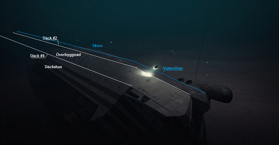 Enligt ovan bild/animation av Estonia-vrakets akter är däckshusets styrbordssida däck #4/8 med skorsten ovanpå däck #9 nertryckt i bottenleran. Det handlar om en modell. Överbyggnadens vita sida, däck #2/4 styrbord är också delvis i leran vid däck #4, medan blåmålade skrovets styrbordssida, däck #0-2, torde vara över bottenleran hela vägen och lätt att besiktiga underifrån och upp. Det är där sprängskadorna finns i maskinrummet akterut och saunan förut.däck #0. Den mystiska sprickan ovan däck #2 är som sagt över lerbotten och har filmats underifrån.