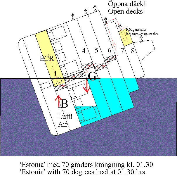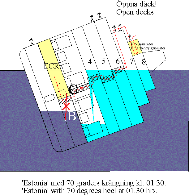 Om slagsidan var minst 75 grader, när Treu nådde nödgeneratorn - hur lyckades han då klättra upp från trappan på däck 7 ut på öppna däck och sedan till generatorn på däck 8, som lutade >70 grader? Treu måste klättra 9 meter rakt uppåt för att komma ut på däck 7! Där många passagerare var blockerade! (Figuren visar sektionen vid kontrollrummet ECR med trapporna föröver - fartyget har akterligt trim och bogen är över vatten med stängd ramp). Eftersom det inte går att ta sig ut från kontrollrummet genom lutande trappor när slagsidan är 45-50-60-70-75 grader (trapporna blir värdelösa redan vid 15-20 graders slagsida), har de tre (eller utredarna), informellt (det sägs ej i slutrapporten), meddelat att de tre tog sig ut genom maskinrumsschaktet, däck 1 - 9, upp till skorstenen på däck 9 och ner till nödgeneratorn på däck 8. I detta schackt finns förvisso stegar och lejdare (för underhåll och rengöring av avgasrör o.dyl. (isolering, gasläckor, sot, etc.)) men de fungerar inte heller när slagsidan är >25 grader. Det går inte att ta sig från en stege till en annan och det går ej att klättra på en lutande stege och det går ej att klättra på väggarna eftersom schacktet blockeras av rör och plattformar, etc. Och det går ej ens att ta sig till schacktet från kontrollrummet över det lutande maskinrummet! Maskinrumsschacktet är naturligtvis ingen utrymningsväg eller nödutgång, eftersom det utrymmet fylls med rök och C02 vid brand. Och när man kommer till skorstenen kan man inte ta sig ut och upp till nödgeneratorn på babordssidan - schaktet är inte förbundet med nödgeneratorrummet - man måste upp till däck 9, ut på babordskanten och ner till däck 8. Ett schackt från generatorrummet under maskinkontrollrummet passerar genom kontrollrummet, men det finns ingen dörr från kontrollrummet till detta schackt . De enda vägarna ut ur maskinkontrollrummet är (1) en vattentät dörr till maskinrummet, (2) en vattentät dörr till passagerarutrymmet förut och (3) nödutgången till bildäck (en vertikal stege i en trunk med en branddörr på bildäck. Tester på fartyg liknande 'Estonia' visar att det inte finns någon möjlighet att ta sig ut ur kontrollrummet och ta sig till däck 8 och nödgeneratorn, när slagsidan är >20 grader. Därför ljuger maskinrumspersonalen eller var den med om ett mirakel.