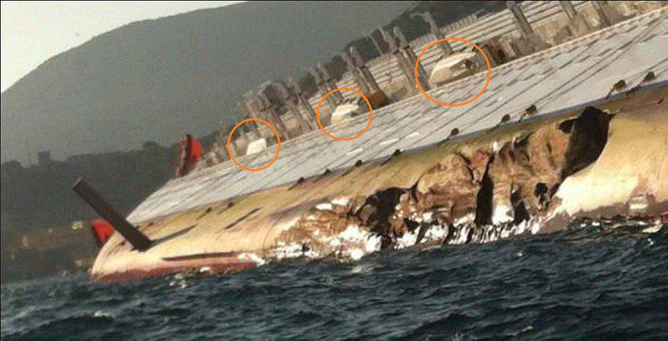 Source: http://www.cbc.ca/gfx/images/news/topstories/2012/09/11/li-concordia-620-ap02248082.jpg All persons climbing down on the ladder should have been evacuated much earlier using the rafts ... but the crew didn't know how to do it. Note one life raft container - hanging in the wire of the crane - at the waterline. It had been lowered ... not opened ... into the sea. A joke. If the evacuation at sea of 5 000 (or 4 252) persons aboard had ever been tested and/or trained in reality is also clear. The system had never been tested! The Italian Ministry of Infrastructures and Transports incident investigation report May 2013 about the incident does not say anything about these serious deficiencies! It just, ridiculously, makes big fuss about the Master at 01.00 hrs not swimming back to the ship after capsize 00.33 hrs on January 14 to check, if anybody was left. Normally practical safety aboard, e.g. abandon ship, fire fighting, etc, is the responsibility of the 1st or Chief Officer together with the Chief Engineer and trained seamen. The basic plans are evidently made by the ship owner ashore. Crew came and went and it was a little chaotic. 27% of the crew (272 crew members out of 1023) had been replaced by the Company during the last six weeks. But nobody cared. Charts? Forget it. No port authority would stop a Costa or Carnival vessel! The ship was evidently not even built according international safety, SOLAS, rules. M/S Costa Concordia had 25 watertight doors in the hull that were not supposed to be there. Illegal! But made it easier for the crew to move around. It is not the first time it happens (Johan Franson, see above, again producing unsafety at sea)! The M/S Costa Concordia was not seaworthy at any time. The four still operating sister ships are equally unseaworthy. The fatal incident January 14, 2012 - capsize - was just bound to happen. And it applies to the sister ships, too. And these dangerous ships continue to trade. Reason? Incompetent ship owner and top management not really interested in safety at sea on big cruise ships! And flag maritime administration. And Port State Controls. And media! Media will not report the truth because then it cannot sell advertisements for dangerous cruising on unseaworthy ships.