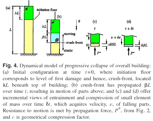 previous section." 1. A rigid upper part lL that is rigid and intact and perfectly aligned with the columns below all the time during collapse. 2. A moving intermediate block bL between the upper part and a crush front that apparently consist of semi-broken parts and produces a crush front, actually 280+ crush fronts that are perfectly applied to the 280+ columns at every stage of the collapse. 3. A static, rigid lower, intact part (1-a-b-l)L below the crush front that produces resistance to motion. It is in fact only the 280+ flexible columns that produce resistance ... if a load is actually applied on them from above. Actually the static lower, intact part (1-a-b-l)L below the crush front is complex structure that gets stronger further down as it is supports all structure/mass above. K.A. Seffen completely ignores that the big lower, intact part gets stronger further down and cannot be crushed from above by anything. The lowest bottom part is 100 times stronger than the top part! It appears that K.A. Seffen is a supporter of terrorists! MI5/6 should investigate! l is constant during the collapse, which is not observed during the WTC collapses. What b is, is completely incomprehensible but should be 0 just before impact at t = 0 and then be variable until the collapse is completed at t = t(end), thus b is a function of time t.